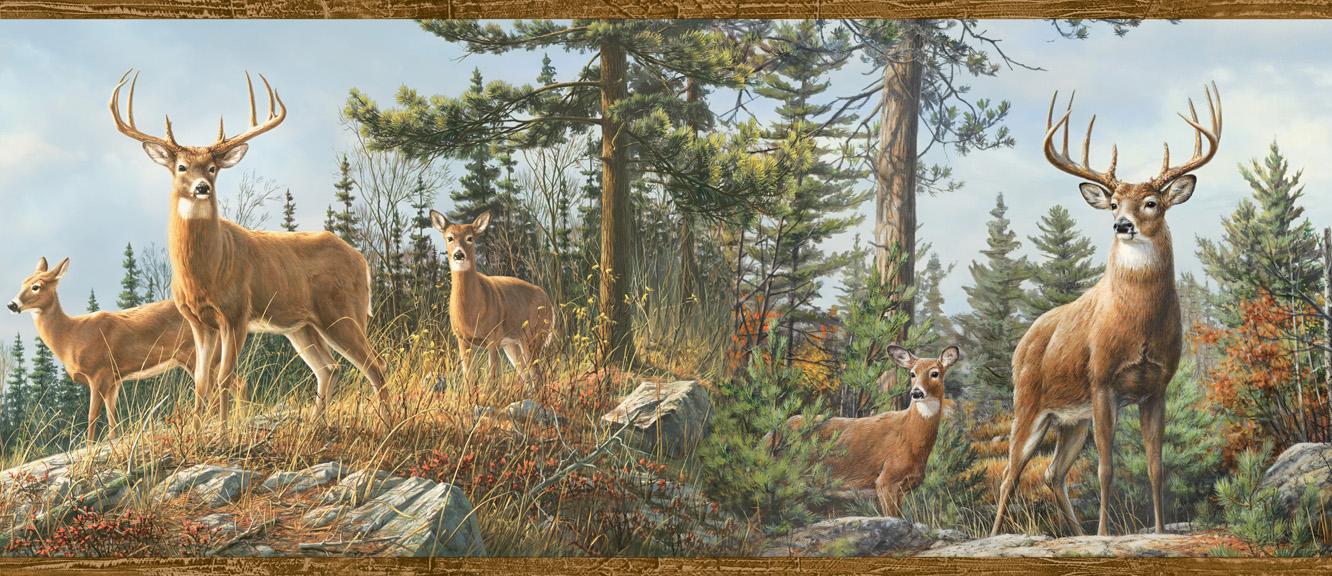 | Regal whitetail deer observe the wooded land surrounding them in this artwork by the Hautman Brothers. This border will add a lovely portrait to any room. Page: 75 Roll Width (in): 8 Roll Length (ft): 15 Prepasted Strippable |