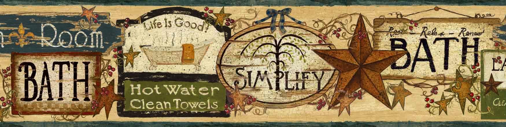 Whether you run a bed and breakfast or have frequent visitors onlookers of this border will always feel welcomed. Perfect for a bathroom or water closet this border features signage in a country decor.