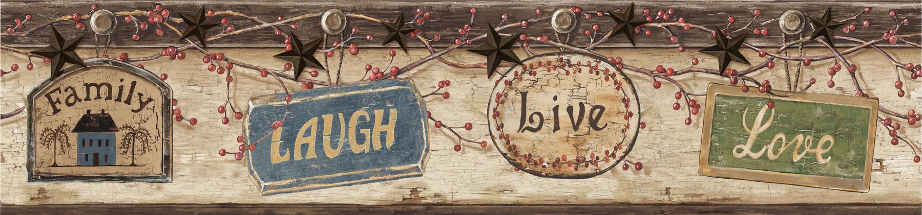 | Remember to always enjoy life to the fullest with the Live Laugh Love wall paper border a perfect motto to inspire daily motivation and cheer. Page: 44 Match: Straight Roll Width (in): 5.6 Roll Length (ft): 15 Prepasted Strippable |