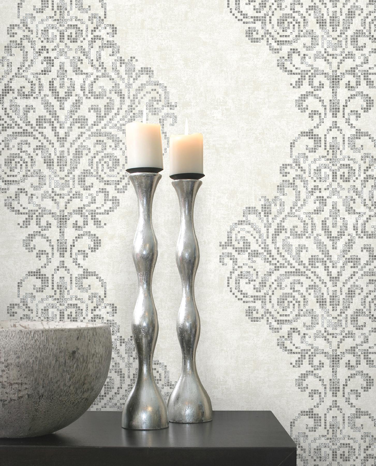 | A large scale damask design is achieved in a current mosaic style. This couture wallcovering is printed with posh silver foils for a high luster metallic glamour. Page: 1 Match: Drop Roll Width (in): 20.5 Roll Length (ft): 16.5 Unpasted Strippable |