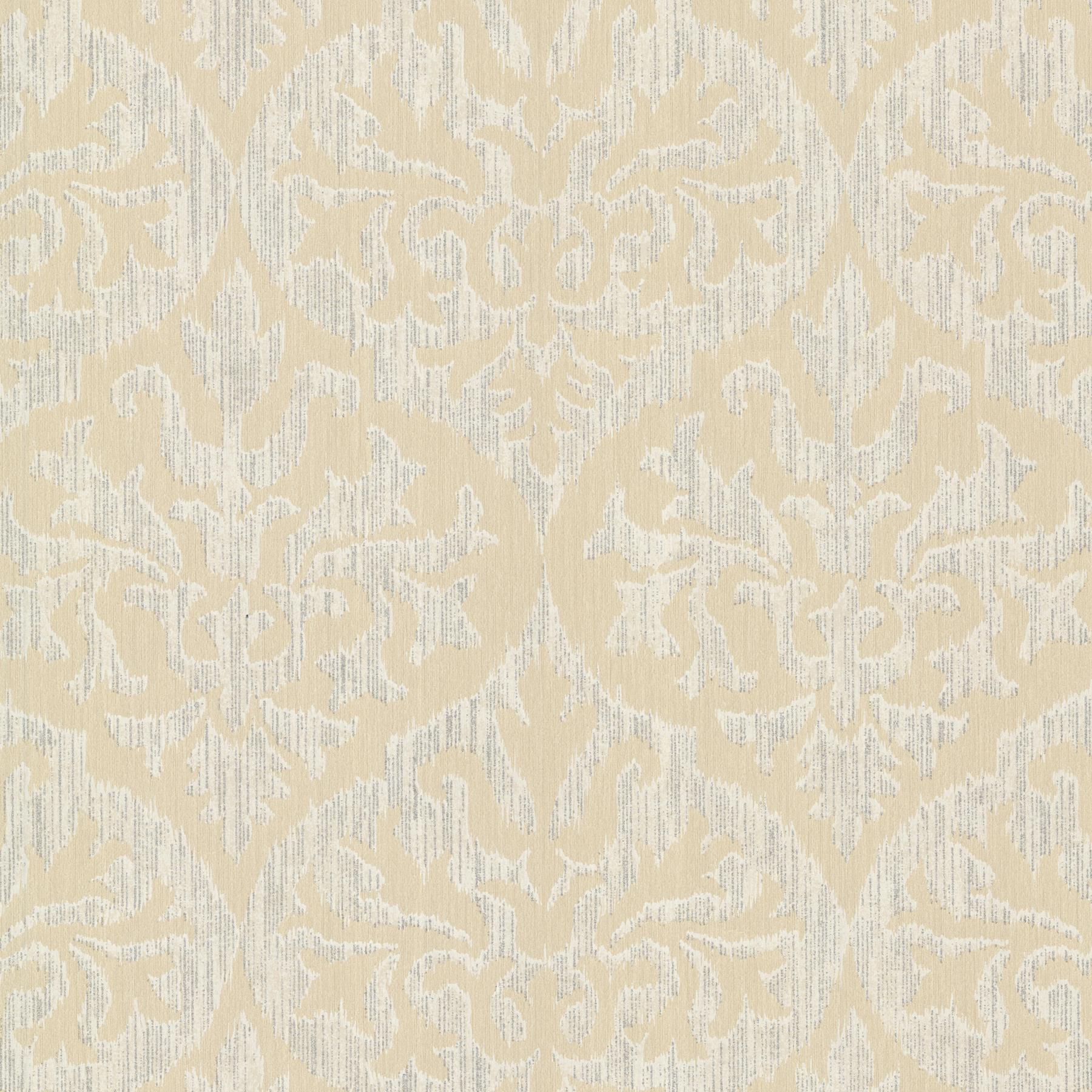 | With a cultured ikat damask design this gold cream and silver wallcovering lends a well-traveled poise to a room. The soft silk texture and glitter ink makes a romantic global-hip fabric effect on walls. Page: 15 Match: Straight Roll Width (in): 20.5 Roll Length (ft): 16.5 Unpasted Strippable |
