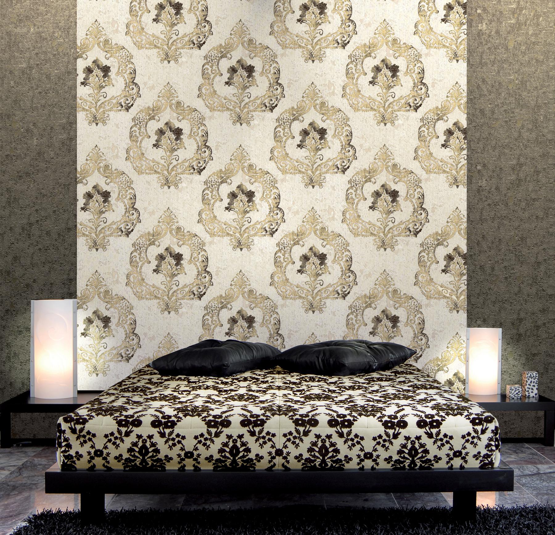 | A regal damask printed wallcovering on a crushed velvet textured bed presents to your walls fine Italian luxury and splendor. Page: 75 Match: Straight Single Double Roll Width (in): 27 Single Double Roll Length (ft): 16.5 Unpasted Peelable |