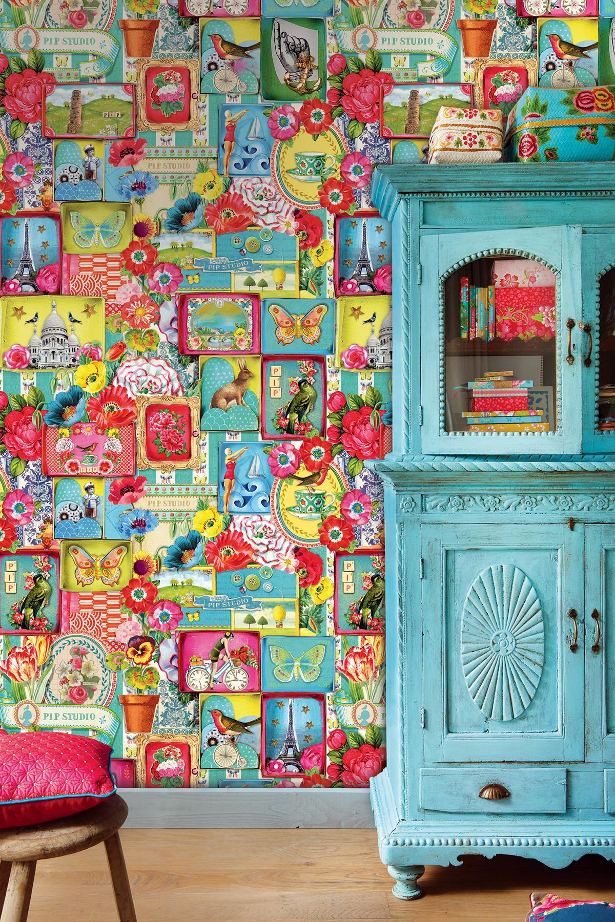 A vintage collection of old postcards and antiques frames, bright florals and glorious butterflies. This gorgeous collage of the past and present adds a sweet charm to walls. Comes in two panels that assemble into a 9 2 x 3 1 mural.