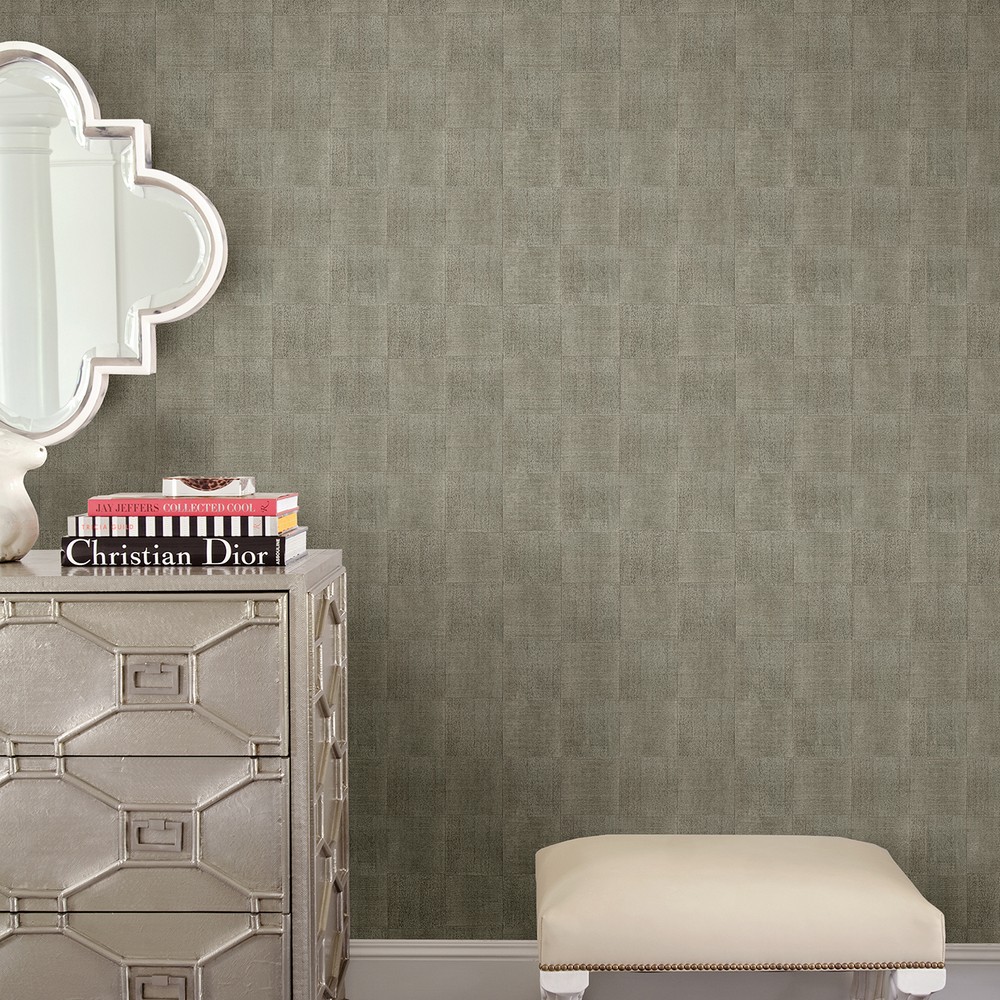 | Create a modern look with this wood wallpaper. The design has a unique sage green color wash and a metallic finish that adds a high shine effect. The 3.5 inch squares create a parquet effect. Page: 55 Match: Drop Roll Width: 27 Roll Length: 27 Unpasted Strippable Textured Faux Wallpaper |