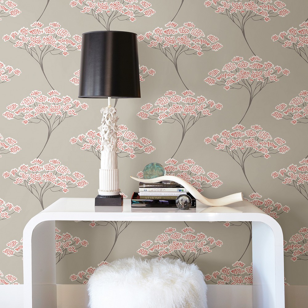 | Update your walls with this unique tree wallpaper. Beautiful banyan motifs pop in white and coral. Metallic grey trunks add a slight shimmer. Page: 59 Match: Straight Single Double Roll Width: 20.5 Single Double Roll Length: 33 Unpasted Strippable Leaves And Vines Wallpaper |