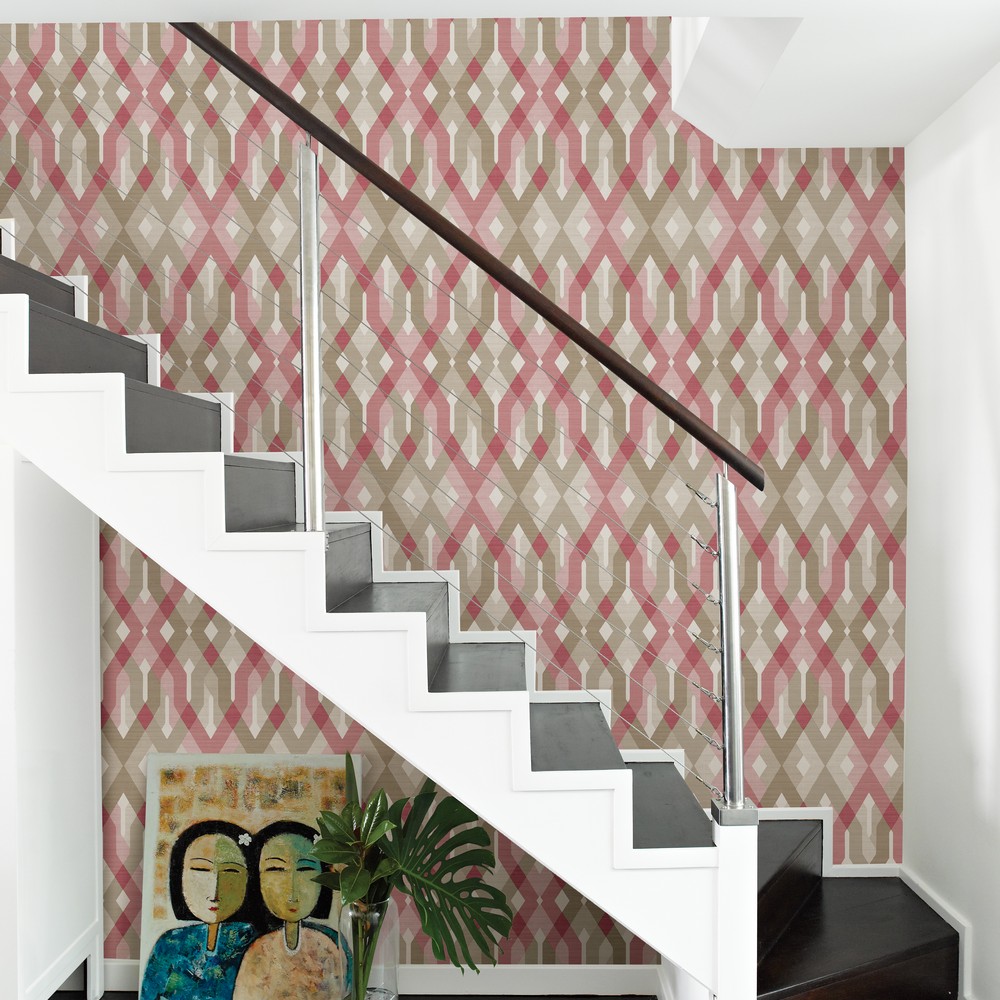 | Pretty shades of pink contrast with shadowy browns and greys in this modern geometric wallpaper. This unique design combines classic trellis patterns with bold line work done in a sheer wash. Page: 66 Match: Straight Roll Width (in): 20.5 Roll Length (ft): 33 Unpasted Strippable Diamonds And Ogee |