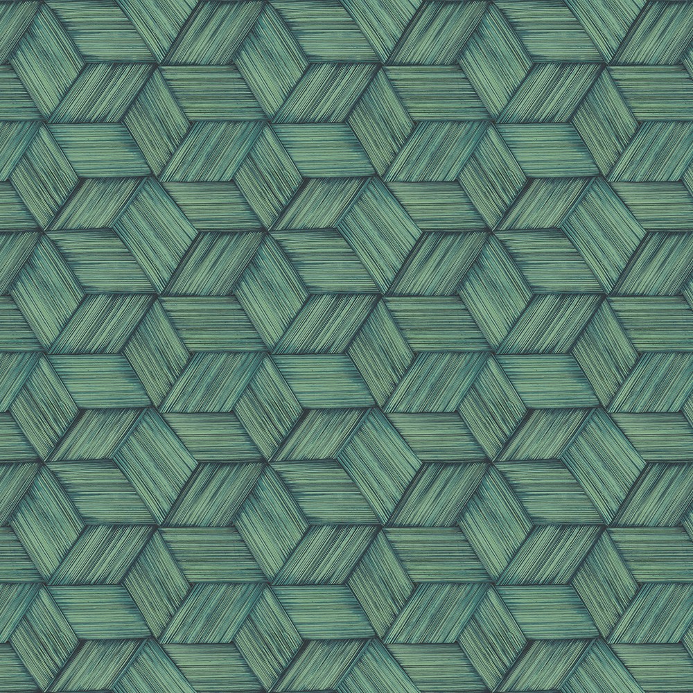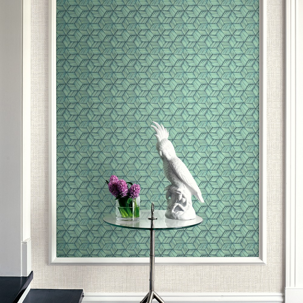 | A stunning geometric wallpaper. This woven print has true dimension. Shades of navy, denim, and white create a modern design. Page: 18 Match: Straight Roll Width (in): 27 Roll Length (ft): 27 Unpasted Strippable Book: Kenneth James Palm Springs |