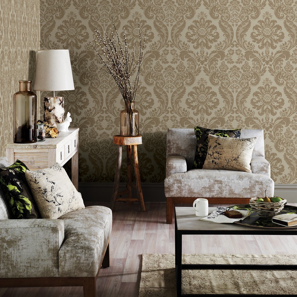 | Velvet-like flocking create a luxurious large scale damask wallpaper. The warm beige tones are mixed with a cream pearlescent-flecked background that shimmers in the light. A-Street Prints Page: 60 Match: Straight Unpasted Damasks Strippable A-Street Prints Moonlight Wallcoverings Book # 2763 Double Double Roll Width: 20.5 in Double Double Roll Length: 33 ft Wallpaper Colors: Browns Modern Damasks Wallpaper for Walls |