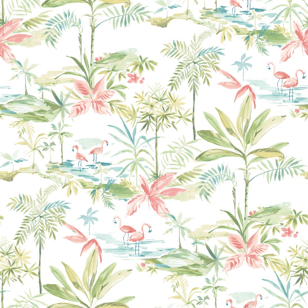 A joyful medley of island adventure. This watercolor wall covering is full of tropical discoveries from palm trees and lagoons to playful pink flamingos. Shades of green, pink, and blue make the summery scene.