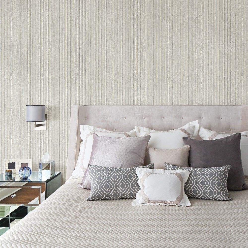 | Rustic with a touch of glam, this textured wall covering has raised ink and metallic details. This striped wall covering is rustic and current with its gorgeous ivory, sterling, and stone coloring. Brewster Page: 75 Match: Random Double Roll Width (inches): 20.5 Double Roll Length (feet): 33 Unpasted Striped Textures Strippable |
