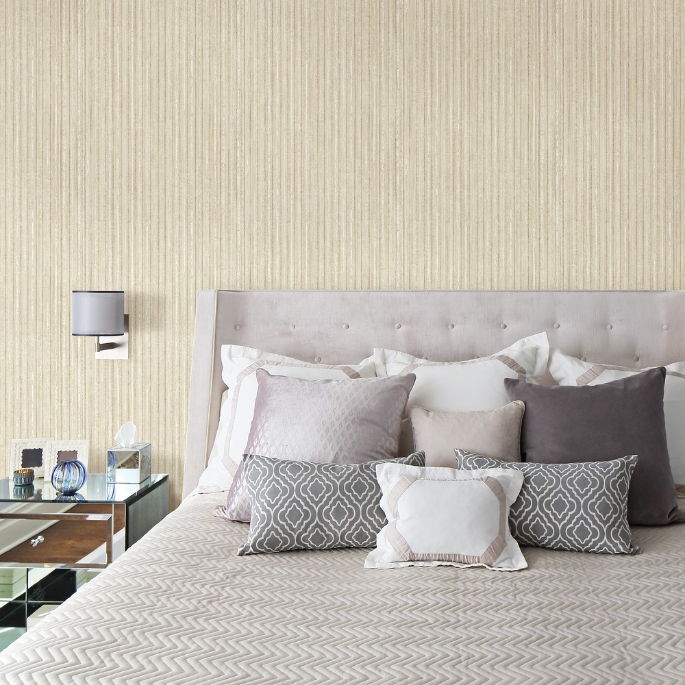 | Rustic with a touch of glam, this textured wall covering has raised ink and metallic details. Illuminate your room with this combination of ivory and gold stripes. Maison is an unpasted, non woven wall covering. Brewster Page: 77 Match: Random Double Roll Width (inches): 20.5 Double Roll Length (feet): 33 Unpasted Striped Textures Strippable |