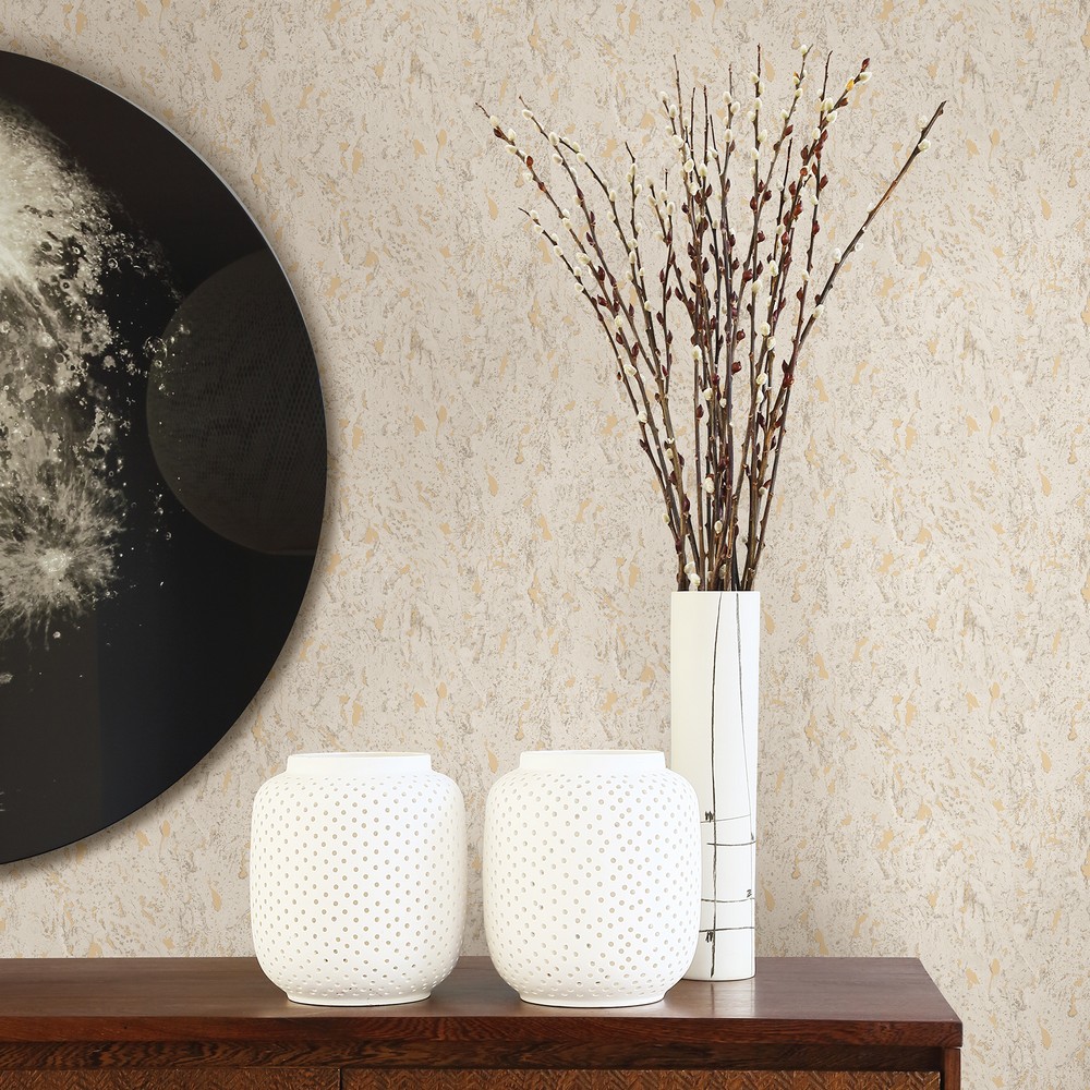 Display the rich textures of real cork with our faux wall covering offset with glimpses of fabulous metallic shine. The newness of the creamy white and the organic texture of cork makes an airy easy look. Adrift is an unpasted, non woven wall covering.