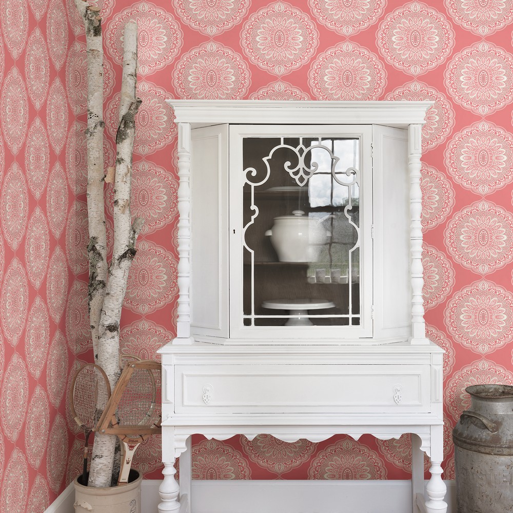 Awaken your walls with this vivid coral print. White bohemian medallions with grey details bloom against a bright background, creating a free-spirit style. Bolinas is a prepasted, high performance wall covering.
