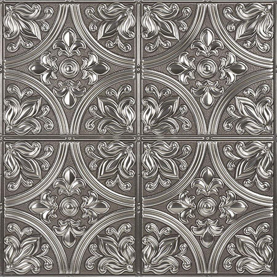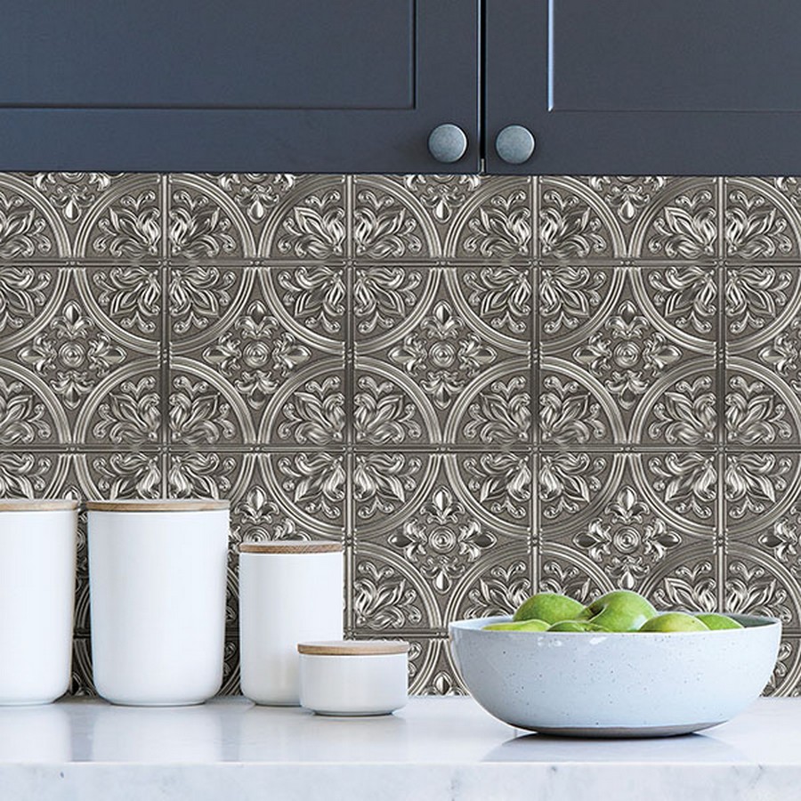 | Faux tin tiles have a silver hue and gorgeously detailed design. The peel and stick material makes it possible to add a gorgeous backsplash to a rental or an apartment. Chelsea Silver Tin Peel & Stick Backsplash Tiles Peel and Stick Tiles contains 4 pieces on 4 sheets that measure 10.5 x 10.5 inches. Repeat: No Repeat InHome Wall Art Kits Peel & Stick Tiles # of Pieces: 4 Kitchen & Bath Graphics Graphics Farmhouse |