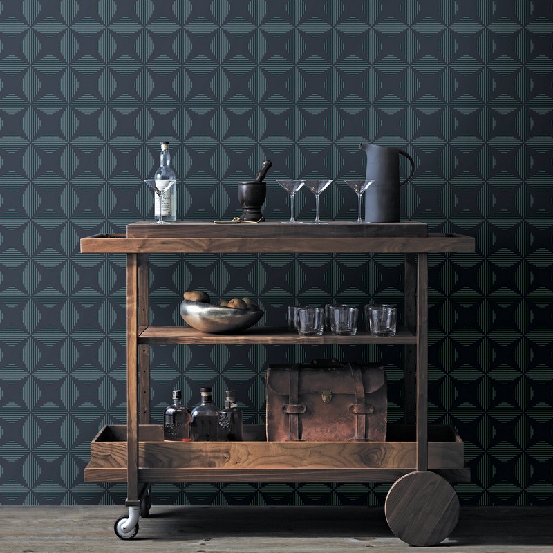 | A navy backdrop accentuates the teal lines that comprise this unique diamond geometric. Its hip and current design will make a eye-catching look in any room. Telestar is an unpasted, non woven wallpaper. Brand: A-Street Prints Match: Straight Double Roll Coverage: About 56.4 square feet Paste: Unpasted Strippable current Geometrics Abstract |