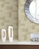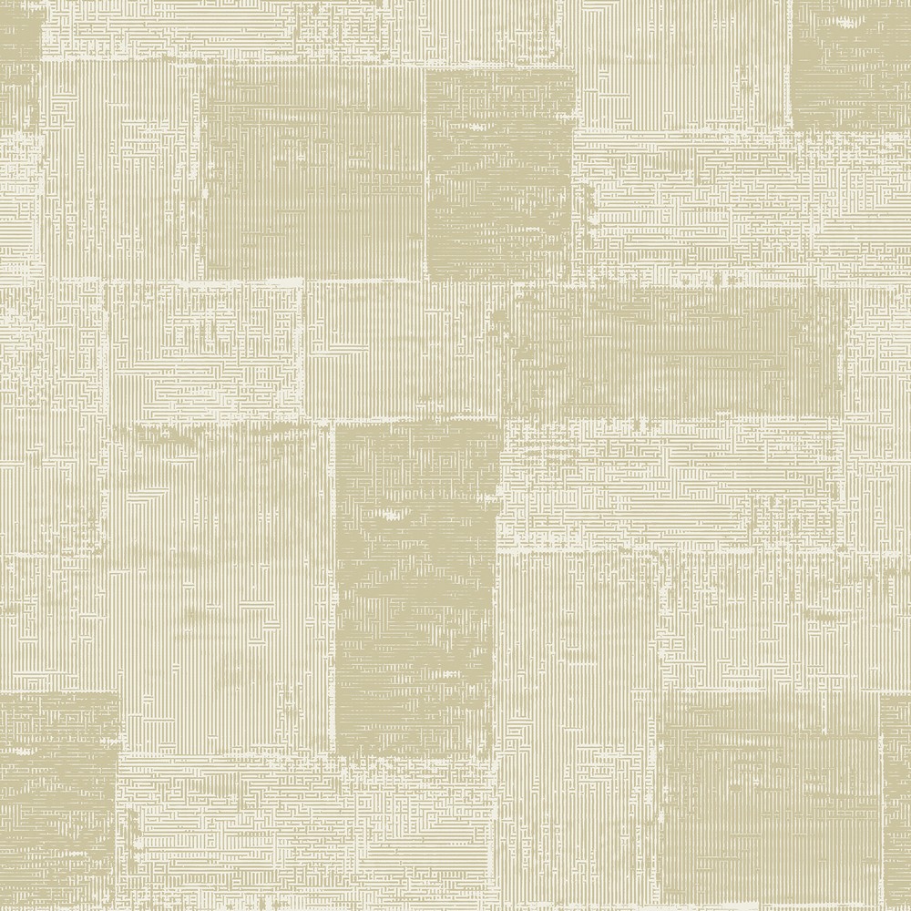 A white patchwork design effortlessly complements a Glistening gold background in this boho hip wallpaper. Its distressed design is accented by raised inks and Greek key details. Composition is an unpasted, non woven wallpaper.
