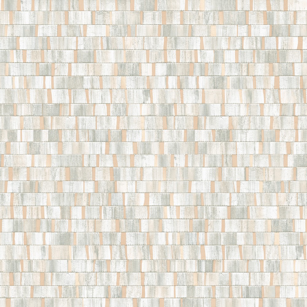 Adorn your walls with this dazzling geometric design. Distressed white rectangles, with sage undertones, pop against a champagne background, creating a dimensional design. Dobby is an unpasted, non woven wallpaper.