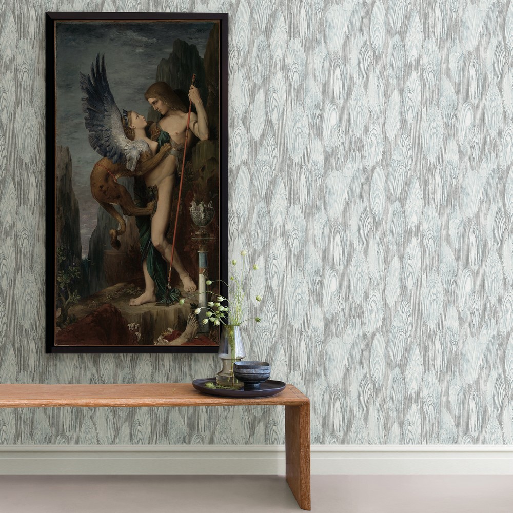 A wood inspired print with a modern twist, this abstract wallpaper is perfect for current homes. Its textured design is accented by silver highlights and slate shades. Monolith is an unpasted, non woven wallpaper.
