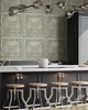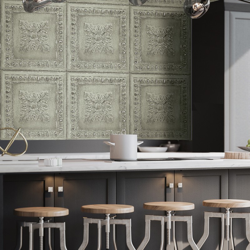 Designed to resemble distressed tin, this wallpaper perfectly balances vintage and industrial styles. Silver inks gorgeously meld with its light green hue. Hillman is an unpasted, non woven wallpaper.