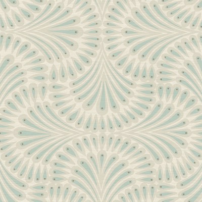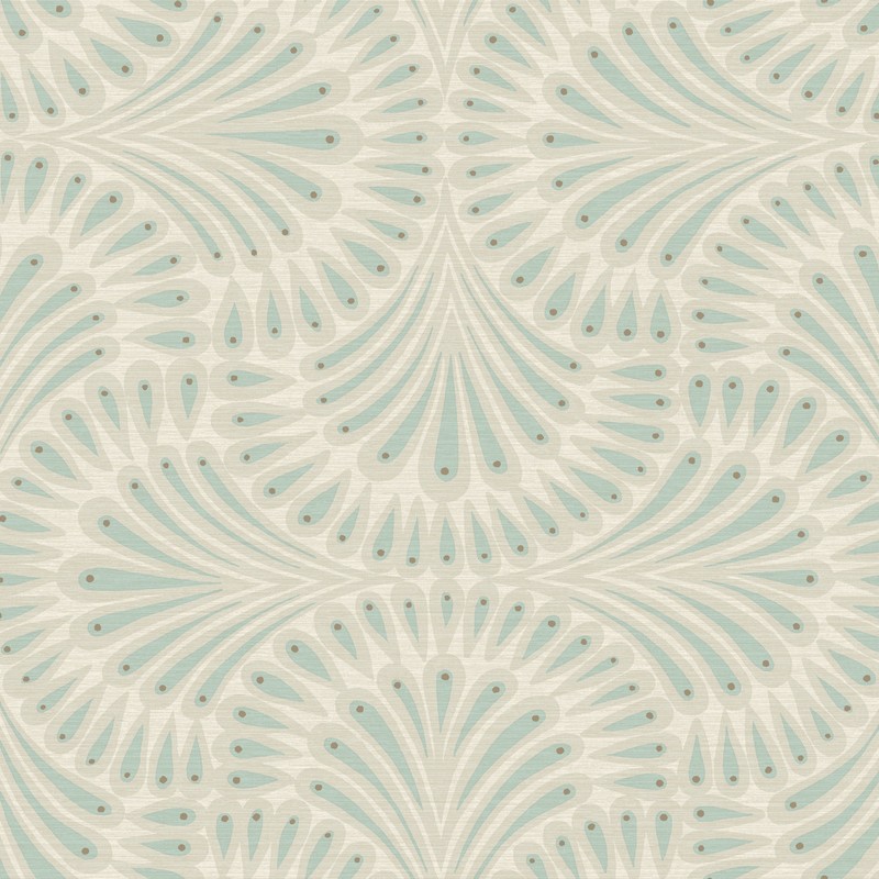 A graceful curvilinear design, Cabaret Wallpaper is punctuated with metallic dots and features stylized peacock feather fans reminiscent of a 1920s dancer's costume.