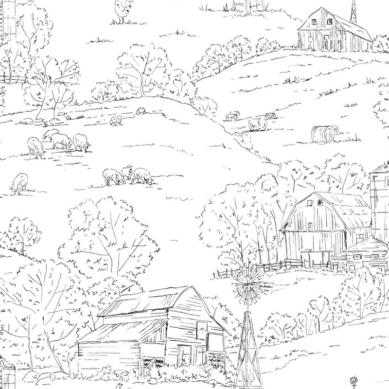 | An afternoon of peaceful outdoor sketching may have yielded this rural landscape complete with grazing sheep, curious hens, rustic barns, hay bales, and windmills; a breath of fresh air, this is Pasture Toile Wallpaper. Unpasted - Washable - Strippable Packaged and sold as a double roll Repeat: 20.5 in. Match: Drop Simply Farmhouse Toile Black And White Wallpaper |