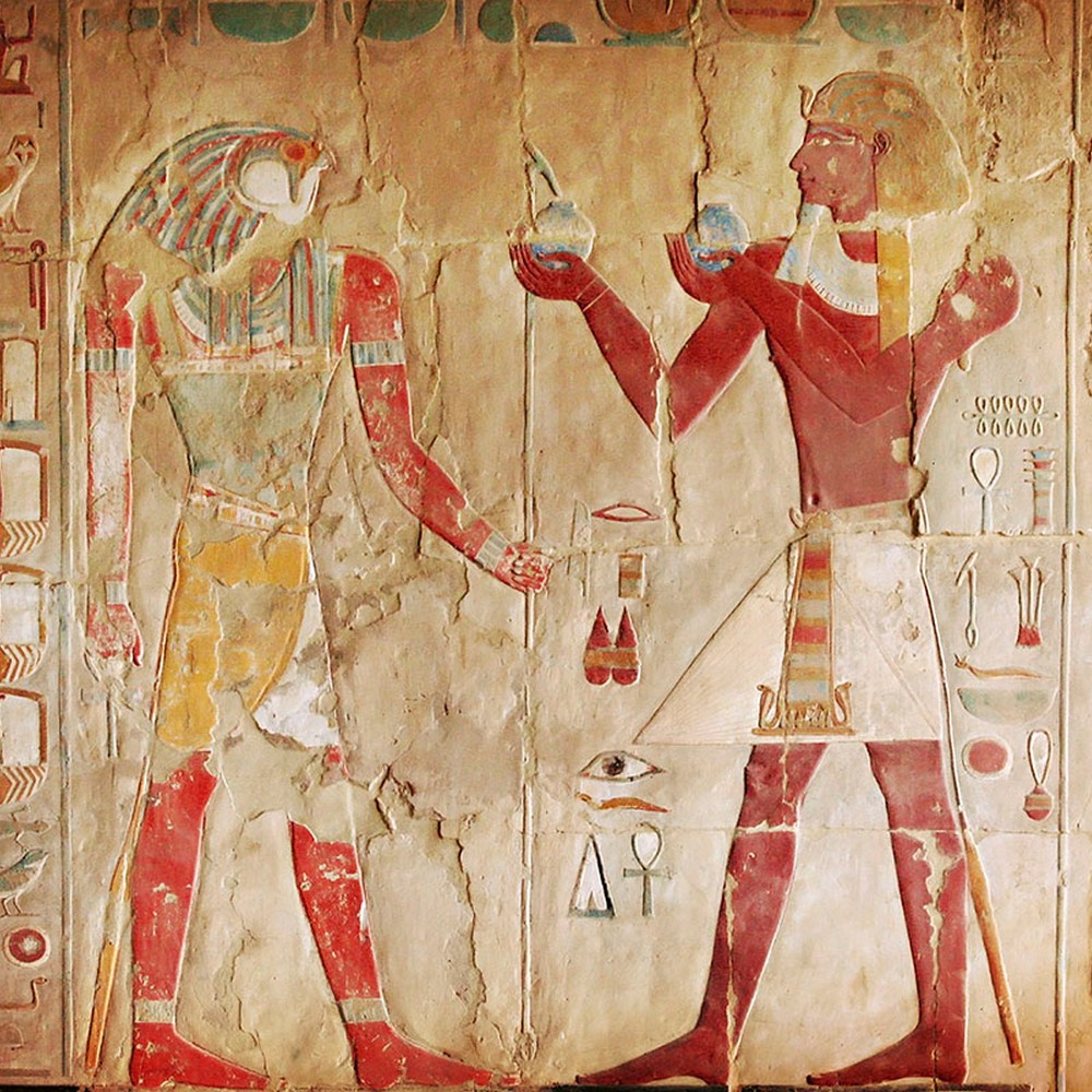 Explore the wonders of Ancient Egypt with this archeological wall mural. The carving depicts a conference between a pharaoh and Egyptian god, with additional hieroglyphs to tell the story of the encounter. Egypt Painting Wall Mural comes on 5 panels.