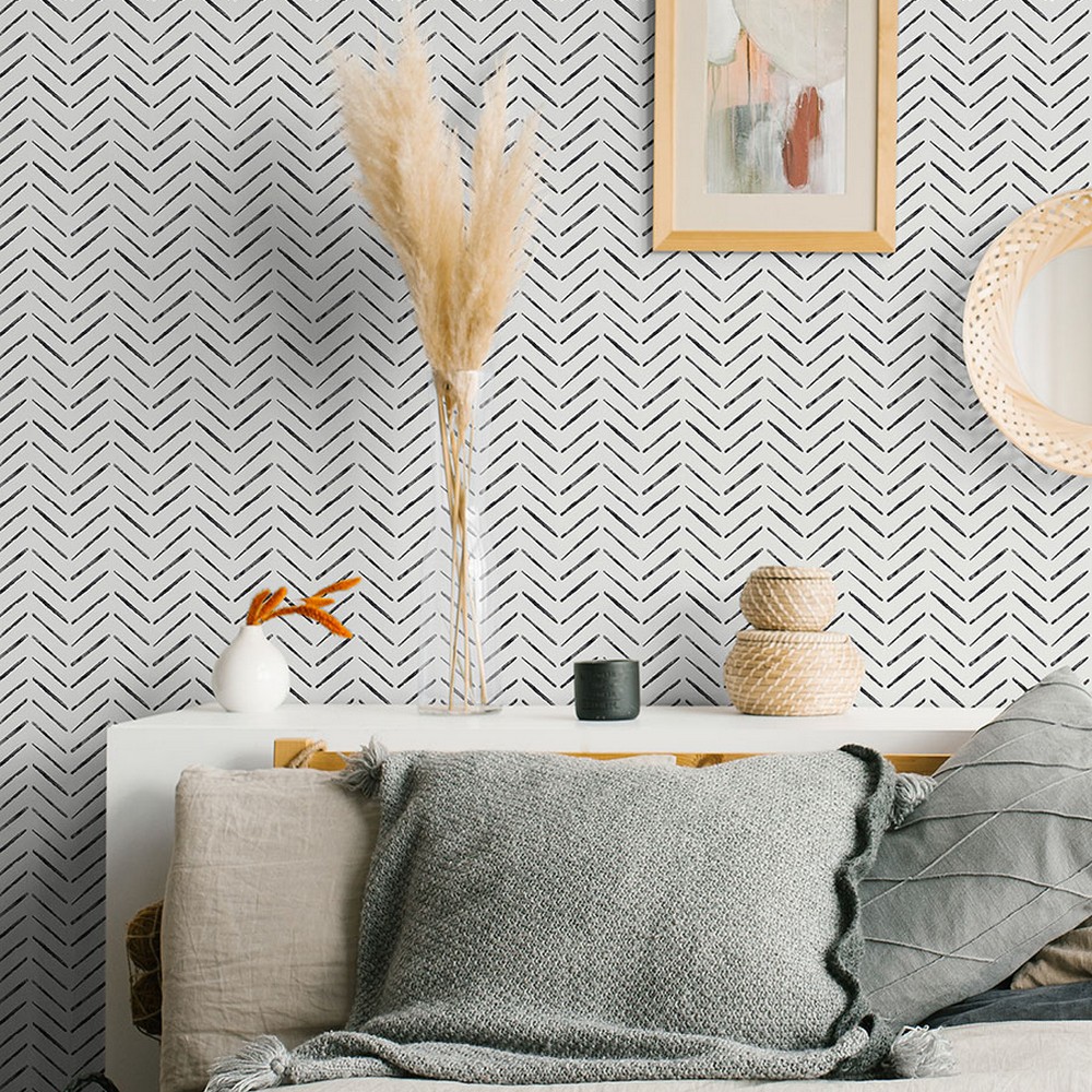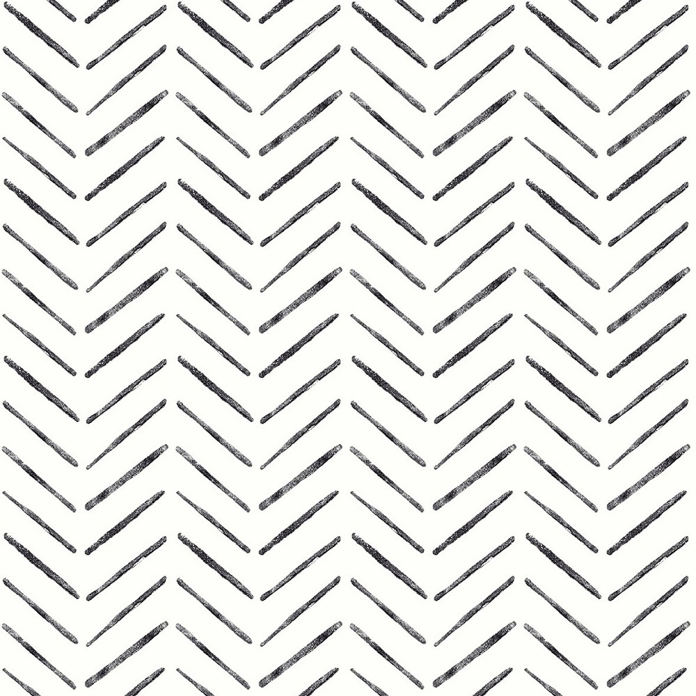| current and hip, this geometric design is a enduring option for your wall decor. Its black chevron design is set against a white backdrop and is the perfect choice for neutral interiors or the minimalist decorator. Black Holden Peel and Stick Wallpaper comes on one roll that measures 20.5 inches wide by 18 feet long. Brand: NuWallpaper Match: Straight Sheet Length: 216 Sheet Width: 20.5 # of Sheets: 1 Black and white chevron peel and stick wallpaper Peel and stick to apply, pull up to remove NuWallpaper is safe for walls and leaves no sticky residue behind Easily repositionable while installing NuWallpaper sticks to any smooth, flat surface - perfect for DIY projects Ideal for rental or home decorating Comes on a 20.5-in x 18-ft roll and covers about 30.75 sq. ft Design repeat of 5.25-in current Geometrics Abstract Black And White Wallpaper Chevron Zig Zag And Herringbone |