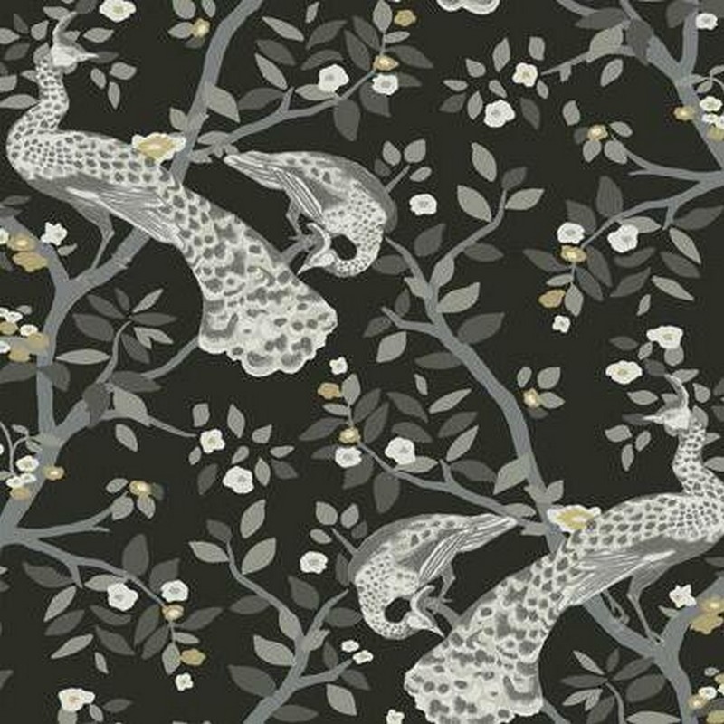 | Art Nouveau inspired fanciful peacocks rest on flowering branches in pattern Plume. Prepasted - Washable - Strippable Packaged and sold as a double roll Repeat: 25.25 in. Match: Straight Black and White Resource Library |