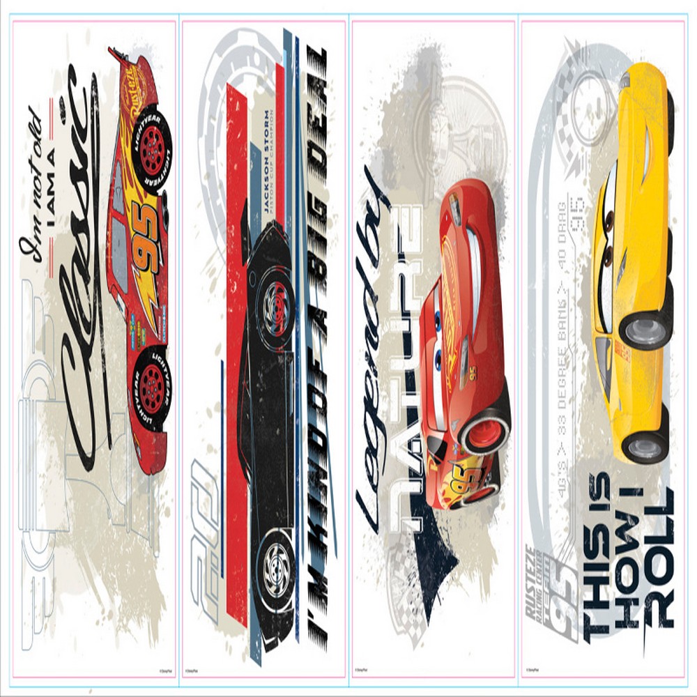 | Decorate walls with Cars 3 Racing Peel and Stick Wall Decals by RoomMates. Complete with four decals this wall sticker set is a fun and creative way to transform any room in seconds. To apply simply peel and stick decals to any smooth flat surface. Remove reposition and reuse as often as needed. create d with high quality vinyl thats made to last walls stay completely safe and sticky residue is never left behind. Its fast fun and affordable wall decor at its best.DISNEY Match: Colors: red yellow black Roll Specs : 4 sheets 9 inches X 17.375 inches Number of Decals : 4 |