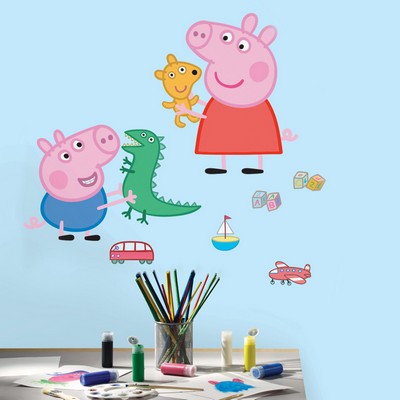 | Add some Peppa fun to your childes wall with these Peppa and George Playtime Giant Wall Decals by RoomMates decor. A gre way to decore a playroom bedroom or even Peppa Pig themed birthday party each wall sticker is easy to install and change. Creed with high quality peel and stick vinyl add these to your childes room decor in minutes. To apply simply peel each wall sticker from the backing and apply to any smooth fl surface of your choice.ENTERTAINMENT ONE UK LIMITED Match: Colors: multi Roll Specs : 18 inches X 40 inches Number of Decals : 8 |