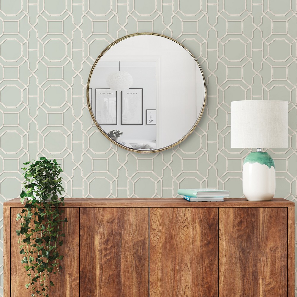 NuWallpaper Traditional Brand: NuWallpaper Match: NA Sheet Length: 216 Sheet Width: 20.5 # of Sheets: 1 Pastel green bamboo trellis peel and stick wallpaper Peel and stick to apply, pull up to remove NuWallpaper is safe for walls and leaves no sticky residue behind Easily repositionable while installing NuWallpaper sticks to any smooth, flat surface - perfect for DIY projects Ideal for rental or home decorating Comes on a 20.5-in x 18-ft roll and covers about 30.75 sq. ft Design repeat of 10.5-in Peel & Stick Wallpaper Geometrics Traditional |