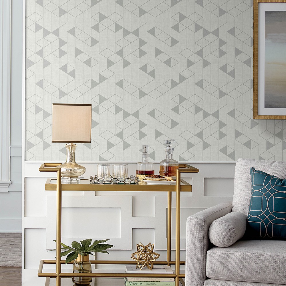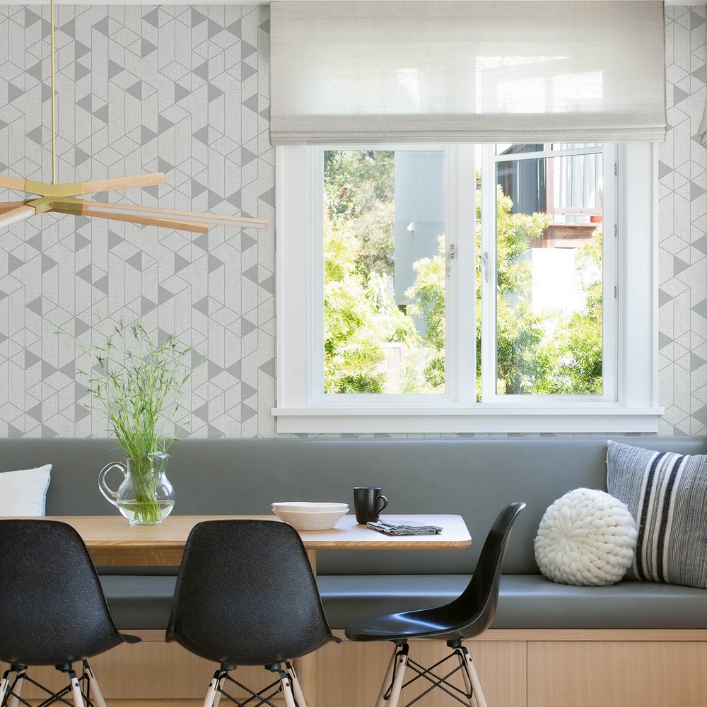 Cool neutral shades bring an elevated touch to this enduring geometric wallpaper. The grid of solid and outlined silver-grey shapes receive extra dimension from the light grey faux linen backdrop. Fairbank is an unpasted, non woven wallpaper measuring 20.5 inches wide by 33 feet long, covering approxiamately About 56.4 square feet square feet per roll