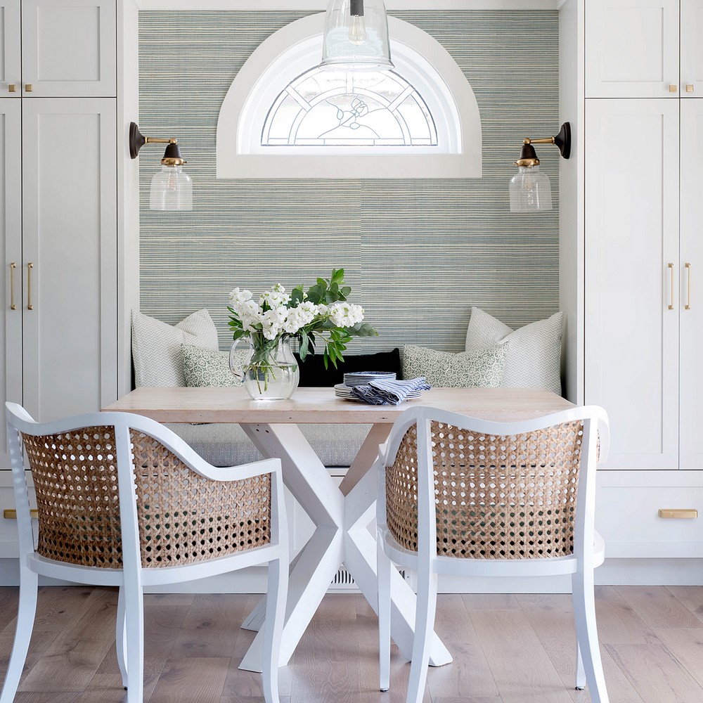 | make interiors rich in color and dimension with this luxurious sisal wallpaper. Thin bands of creamy white alternate with strips of aqua grasses to form a simple yet dynamic backdrop for your home. Kenter is an unpasted, paper wallpaper measuring 36 inches wide by 24 feet long, covering approxiamately About 72 square feet square feet per roll A-Street Prints Page: 19 Match: Random Double Double Roll Width (in): 36 Double Double Roll Length in Feet: 24 Unpasted Graphics Color Family: Blues Texture design Graphics |