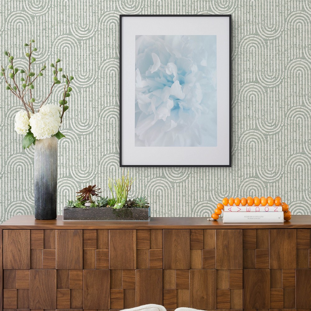| make a room filled with serenity with this geometric wallpaper. Layers of swirling white lines form tranquil waves along a sage green backdrop elevated with faux grasscloth detailing. Trippet is an unpasted, non woven wallpaper measuring 20.5 inches wide by 33 feet long, covering approxiamately About 56.4 square feet square feet per roll A-Street Prints Page: 28 Match: Drop Double Double Roll Width (in): 20.5 Double Double Roll Length in Feet: 33 Unpasted Graphics Color Family: Greens Geometrics Graphics |