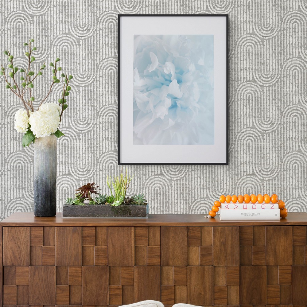 | make restful interiors with this soothing geometric design. Layers of curling white lines form waves along a grey faux grasscloth backdrop. Trippet is an unpasted, non woven wallpaper measuring 20.5 inches wide by 33 feet long, covering approxiamately About 56.4 square feet square feet per roll A-Street Prints Page: 31 Match: Drop Double Double Roll Width (in): 20.5 Double Double Roll Length in Feet: 33 Unpasted Graphics Color Family: Greys Geometrics Graphics |