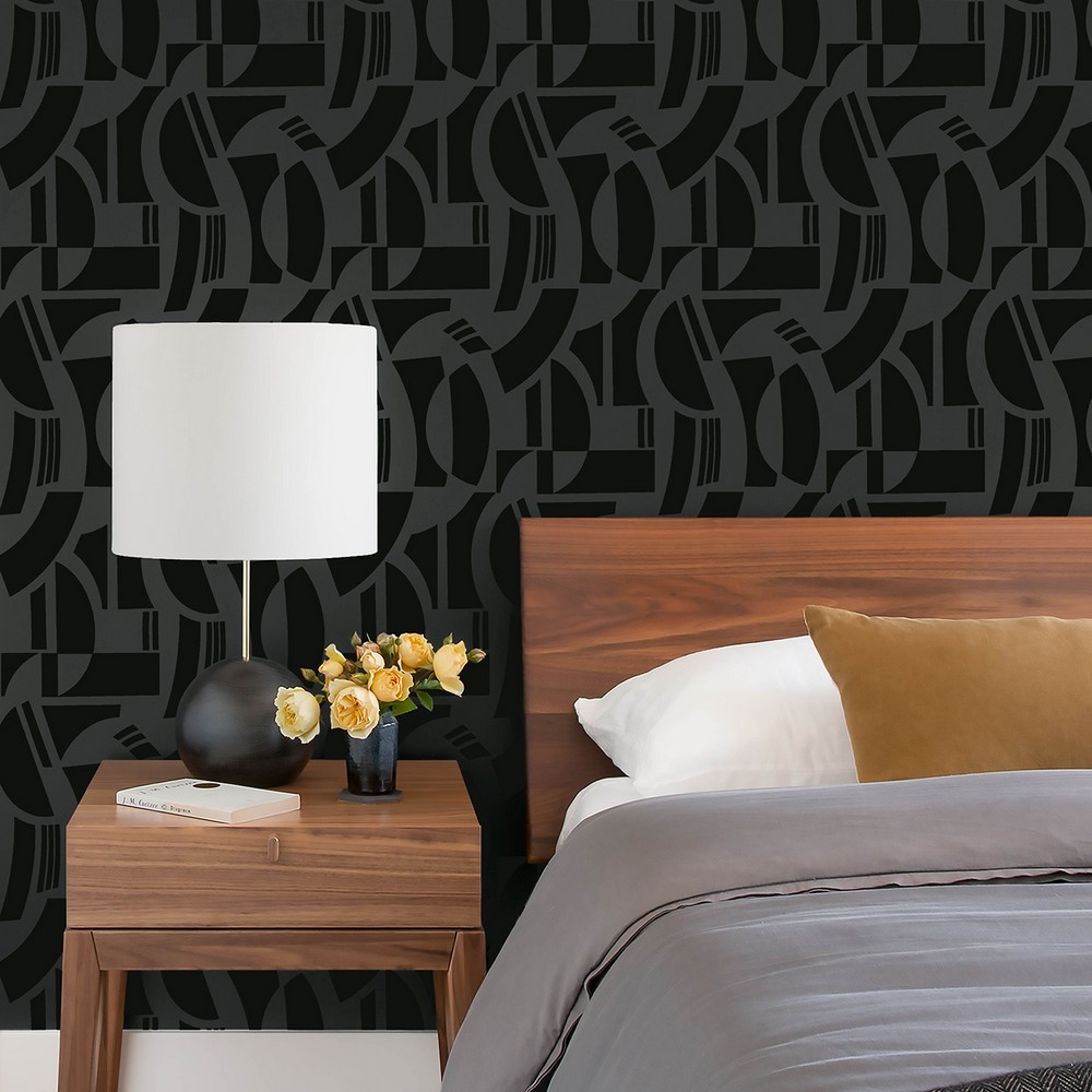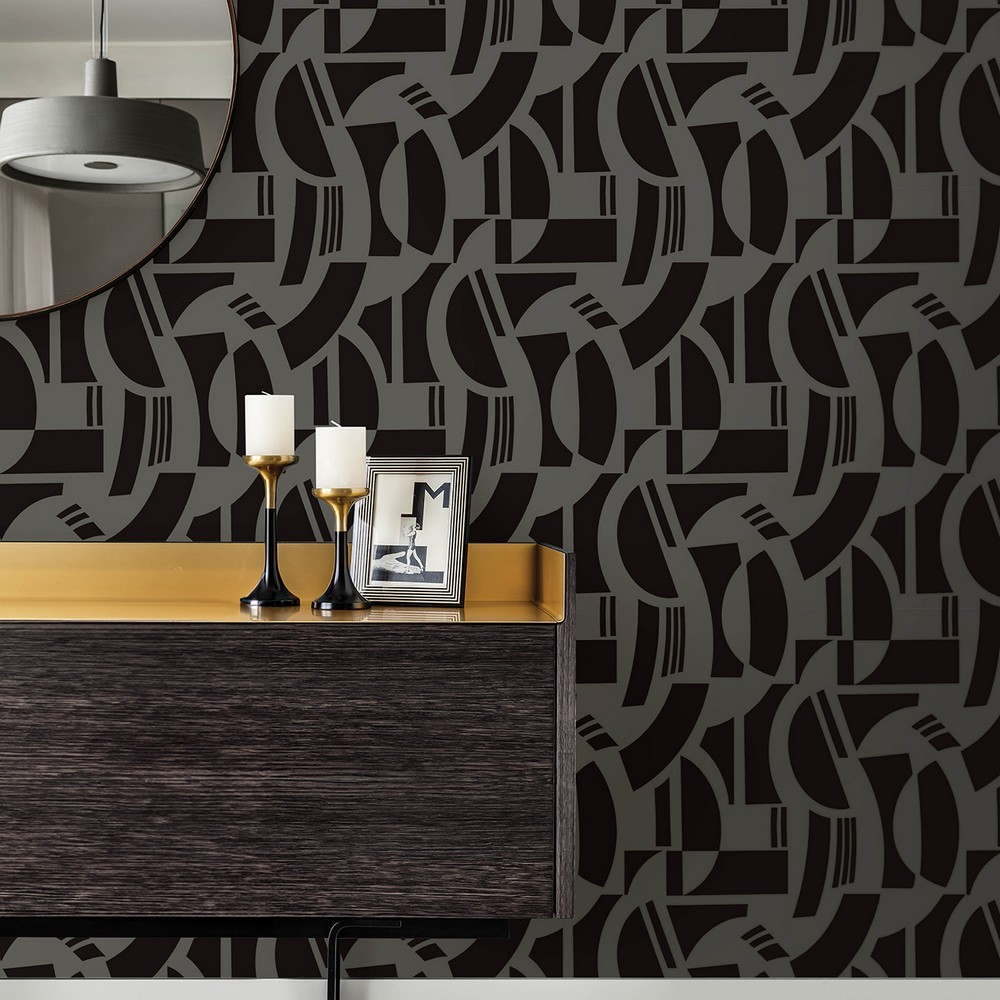Masculine and luxurious, this geometric design is the elevation your walls are craving. A variety of current shapes are formed from velvety black flock offset by a charcoal background. Carter is an unpasted, non woven wallpaper measuring 20.5 inches wide by 33 feet long, covering approxiamately About 56.4 square feet square feet per roll