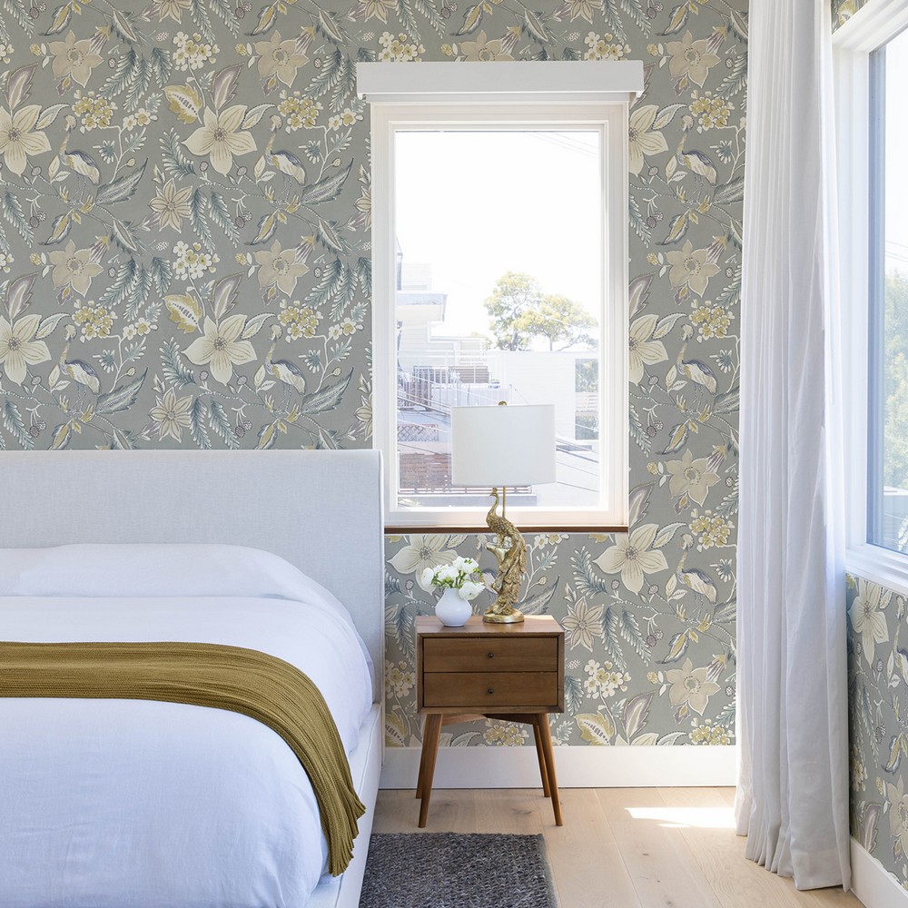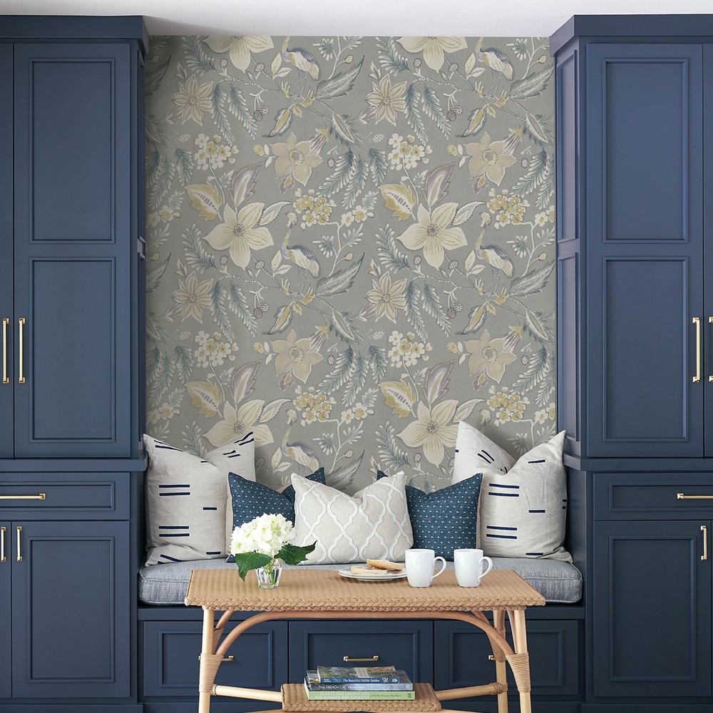 | This floral wallpaper is rich in feminine charm and chinoiserie flair. The winding vines dotted with voluminous flowers and visiting cranes is painted in a variety of blue, taupe, mustard, lavender, and grey watercolor shades. Crestwood is an unpasted, non woven wallpaper measuring 20.5 inches wide by 33 feet long, covering approxiamately About 56.4 square feet square feet per roll A-Street Prints Page: 50 Match: Straight Double Double Roll Width (in): 20.5 Double Double Roll Length in Feet: 33 Unpasted Botanical Color Family: Greys Birds Botanical |