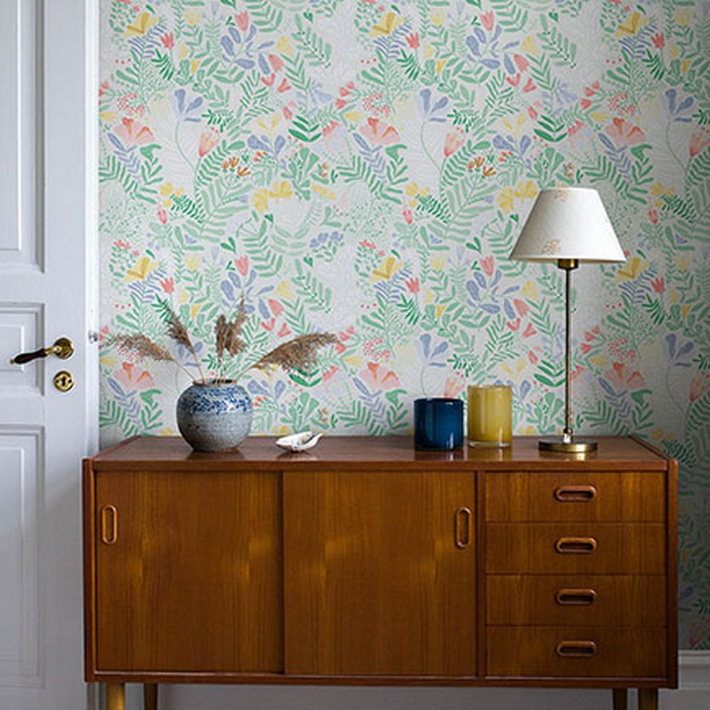 | Enjoy the sweet enchantment of springtime gardens with this Scandinavian-inspired wallpaper. The illustrative design is made more happy with a color scheme of bright green, pink, purple, blue, and yellow softly offset against an off-white backdrop. Brittsommar is an unpasted, non woven wallpaper measuring 20.9 inches wide by 33 feet long, covering approxiamately About 57.5 square feet square feet per roll A-Street Prints Page: 51 Match: Straight Double Double Roll Width in Inches: 20.9 Double Double Roll Length in Feet: 33 Unpasted Botanical Strippable Color Family: Greens Botanical Botanical |
