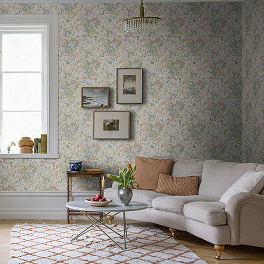 Add instant charm to your interiors with this illustrative floral wallpaper. The feminine accent is enriched with a warm and enduring color scheme of ochre, coral, sage, periwinkle-blue and cream. Hava is an unpasted, non woven wallpaper measuring 20.9 inches wide by 33 feet long, covering approxiamately About 57.5 square feet square feet per roll