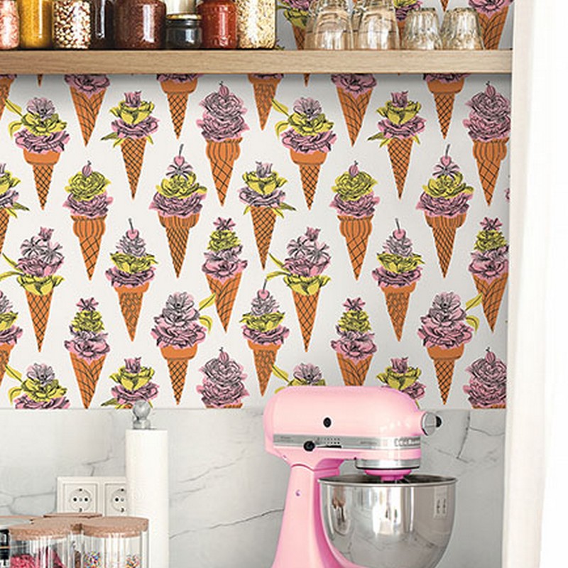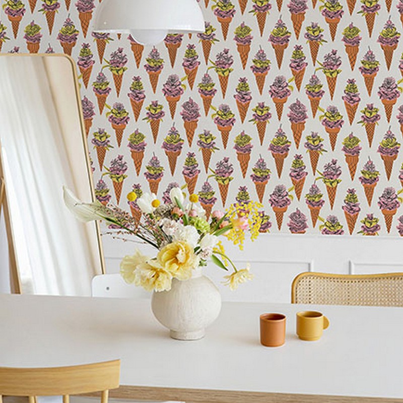 | Treat yourself to a delightfully cheeky accent with this peel and stick NuWallpaper print by Dylan M. Ice cream cones topped with vivid pink and yellow florals are arranged atop a white backdrop. Orange Floral Ice Cream Peel and Stick Wallpaper comes on one roll that measures 20.5 inches wide by 18 feet long. By Dylan M Match: Straight Double Double Roll Width in Inches: 20.5 Double Double Roll Length in Feet: 18 Peel & Stick Botanical Fully Removable Color Family: Oranges Flowers Botanical |