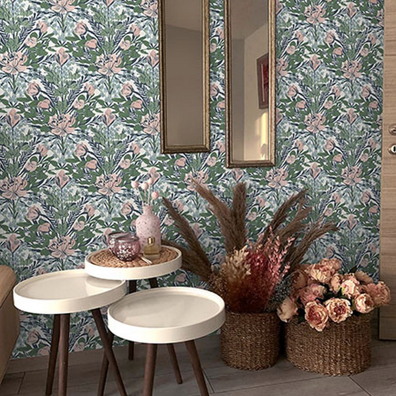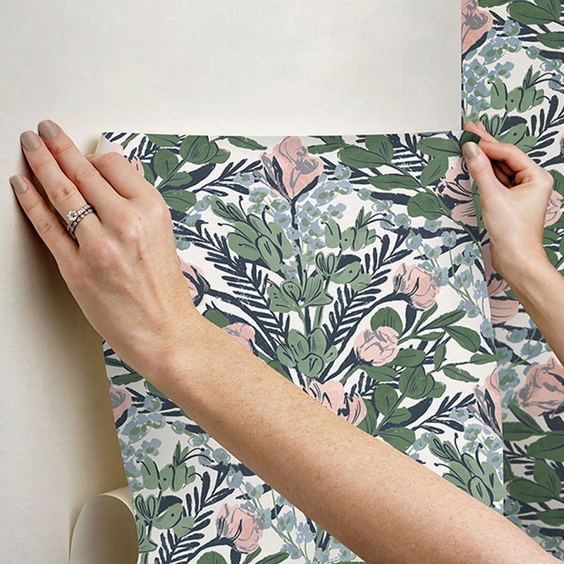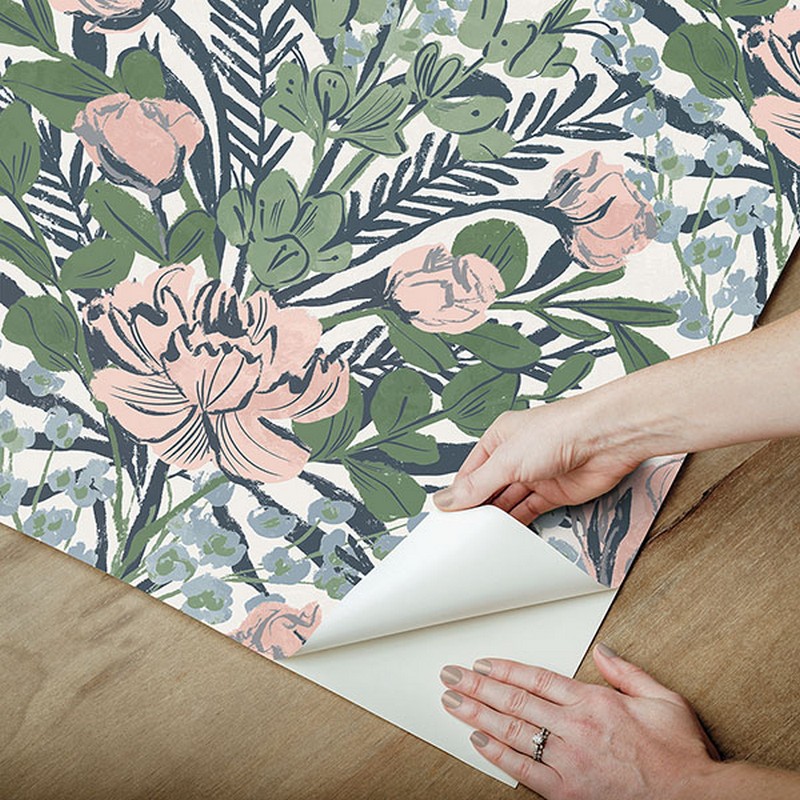 Introduce a whimsical floral accent to any room with this peel and stick NuWallpaper print designed by Dylan M. A curious arrangement of soft pink and blue florals make a damask-like design atop a white backdrop. Soft Multi Moody June Blooms Peel and Stick Wallpaper comes on one roll that measures 20.5 inches wide by 18 feet long.