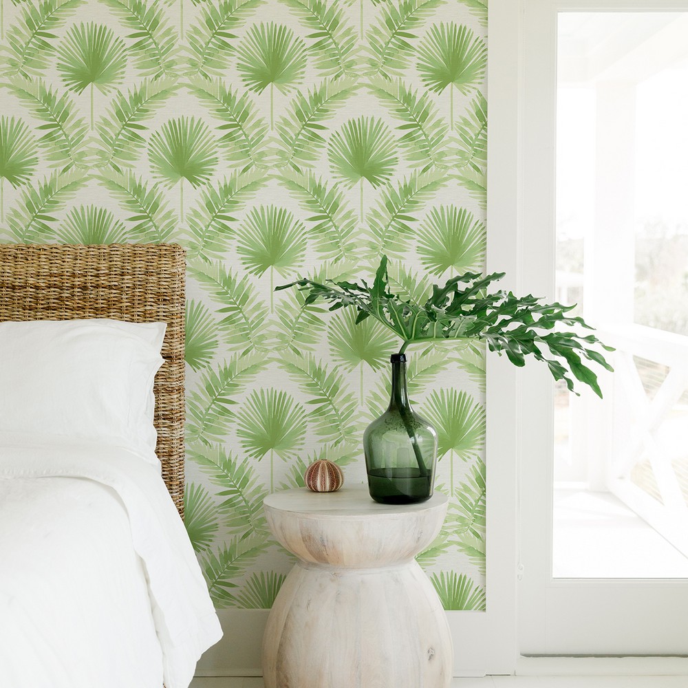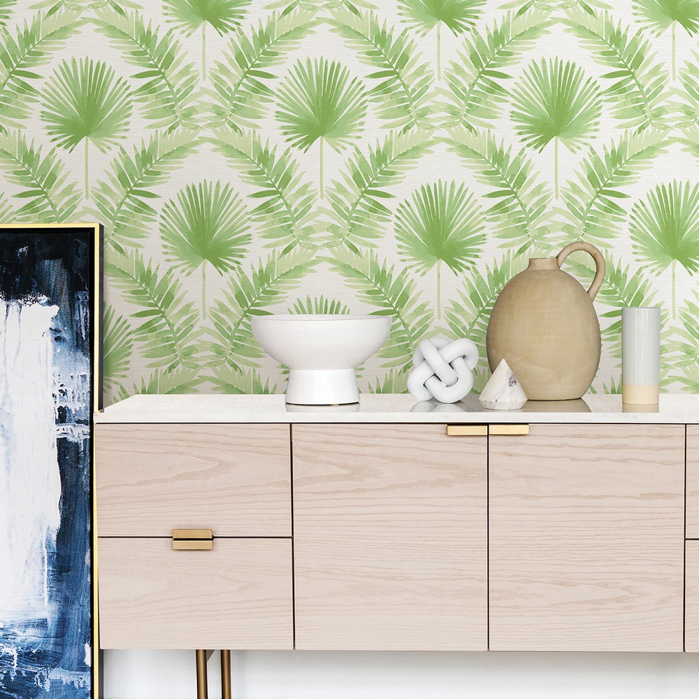 | Enjoy tropical relaxation with this welcoming botanical design. A fanning palm is framed by curving fronds, all painted in shades of green along a white backdrop imbued with woven detailing. Calla is an unpasted, non woven wallpaper. A-Street Prints Page: 9 Match: Straight Double Double Roll Width in Inches: 20.5 Double Double Roll Length in Feet: 33 Unpasted Botanical Strippable Color Family: Greens Botanical Botanical |