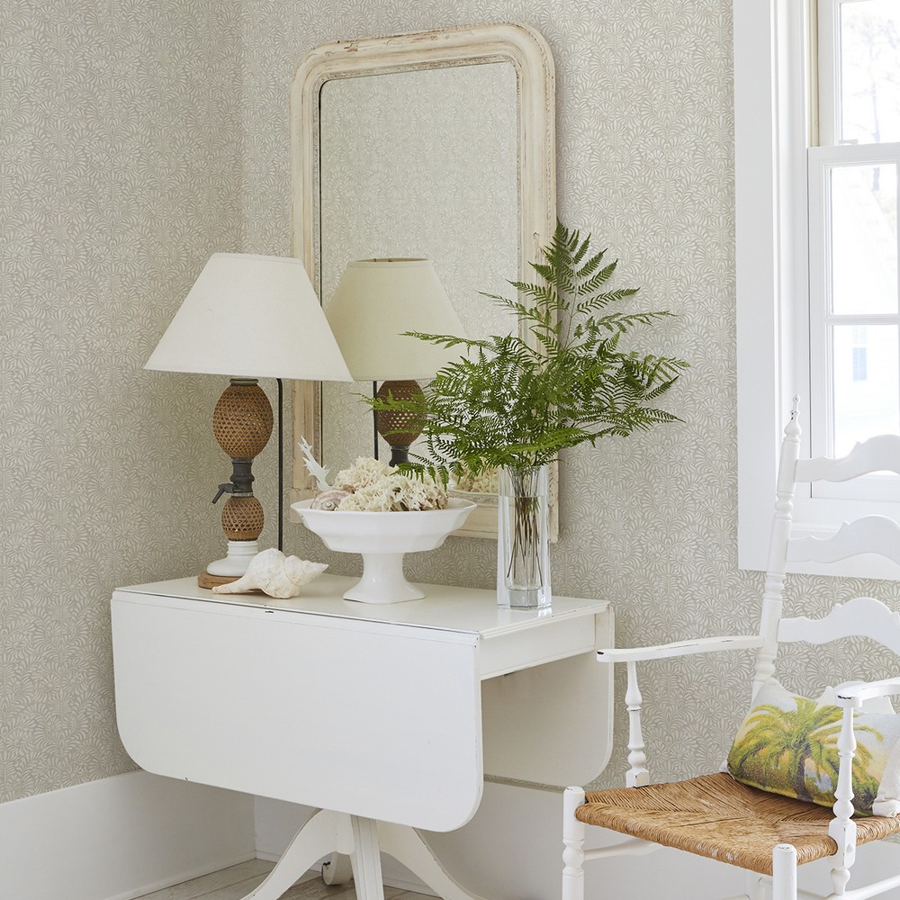 Add a touch of revitalized, antique elegance to your home with this stately botanical wallpaper. This damask design features densely clustered ferns slowly unfurling, the leaves inked in white against a taupe background. Elma is an unpasted, non woven wal