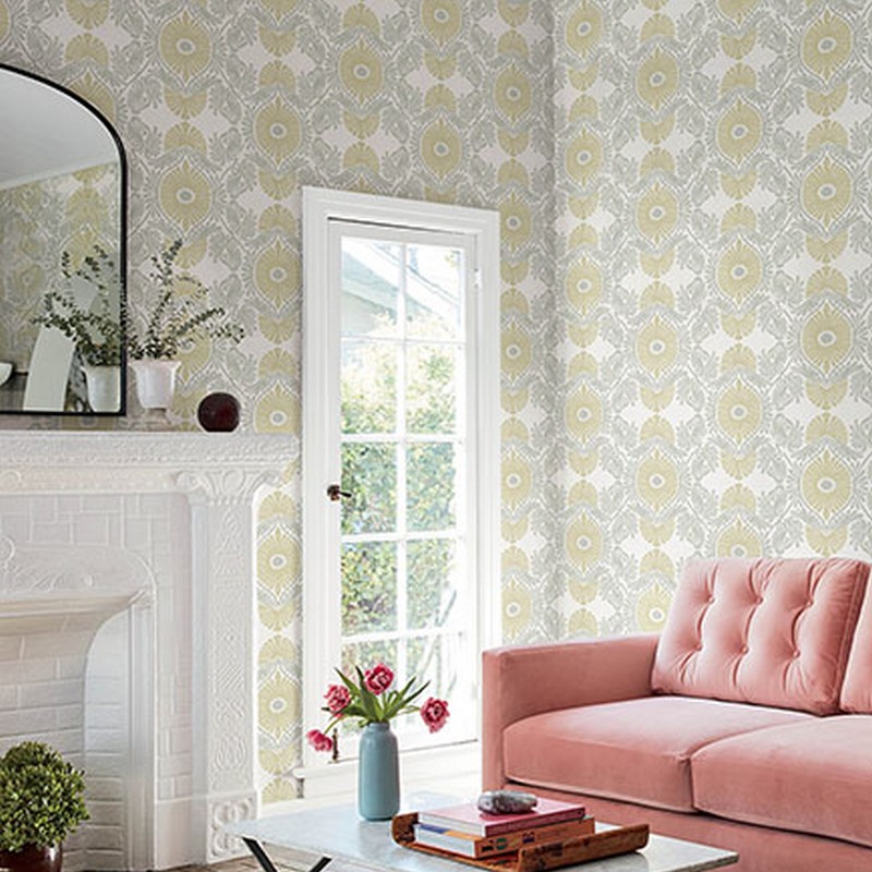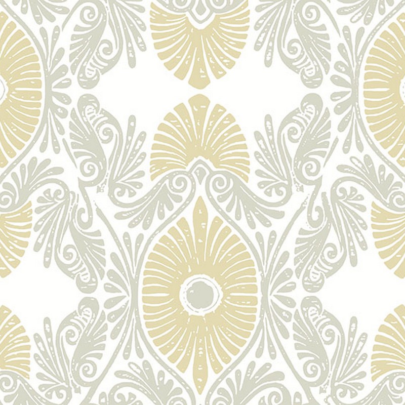 Enjoy rich bohemian flair with this stunning ogee wallpaper. Pale ochre floral medallions are framed by ornate grey scrollwork to create this flowing pattern. Villa is an unpasted, non woven wallpaper measuring 27 inches wide by 27 feet long, covering approximately 60.8 square feet per roll.