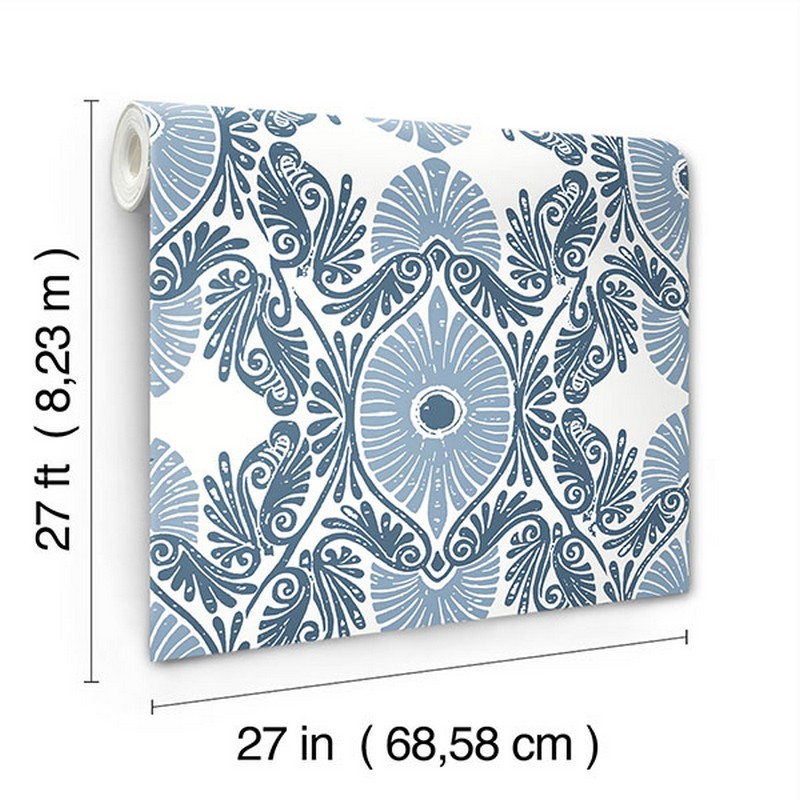 | This stunning ogee design brings chic bohemian flair to your space. Light blue floral medallions are wrapped with ornate blue scrollwork, all offset against crisp white. Villa is an unpasted, non woven wallpaper measuring 27 inches wide by 27 feet long, covering approximately 60.8 square feet per roll. A-Street Prints Page: 8 Match: Straight Roll Width in Inches: 27 Roll Length in Feet: 27 Unpasted Graphics Strippable Color Family: Blues Ogee Graphics |