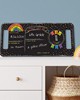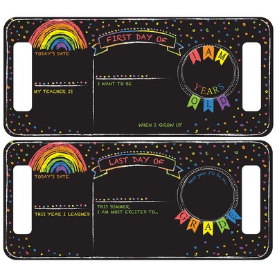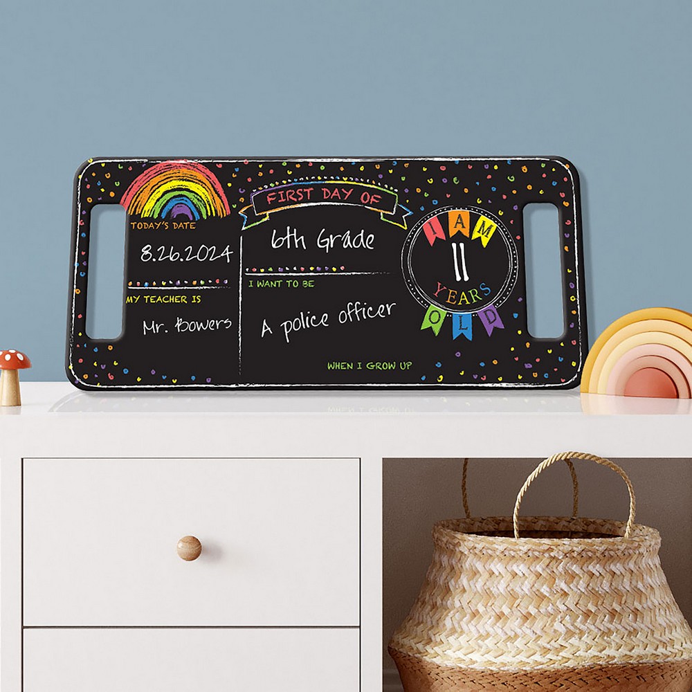 | First and last day of school photos just got a whole lot easier with this reusable and customizable, double-sided chalkboard from RoomMates decor! This rainbow-themed milestone tracker features blank fields you can fill out with your student's information each school year and photograph them holding to document those special memories throughout their academic career! No chalk included; recommended for use with washable chalk markers only. Last or First Day of School Rainbow Chalkboard contains one 8-in x 18-in board. RoomMates Color Family: Blacks Kids Graphics Effect: Chalk |
