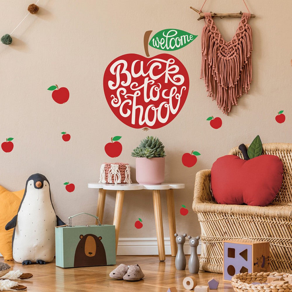 | Head back to school in style with this happy apple wall decal! Perfect as classroom decor for the beginning of the year, this red apple decal with the phrases "back to school" and "welcome" written in white script is almost guaranteed to cheer up the room for your students' first day! Back to School Apple Wall Decals contains F1 pieces on 1 sheet that measures 18.25-in x 17.25-in. RoomMates Color Family: Reds Kids Graphics Effect: |