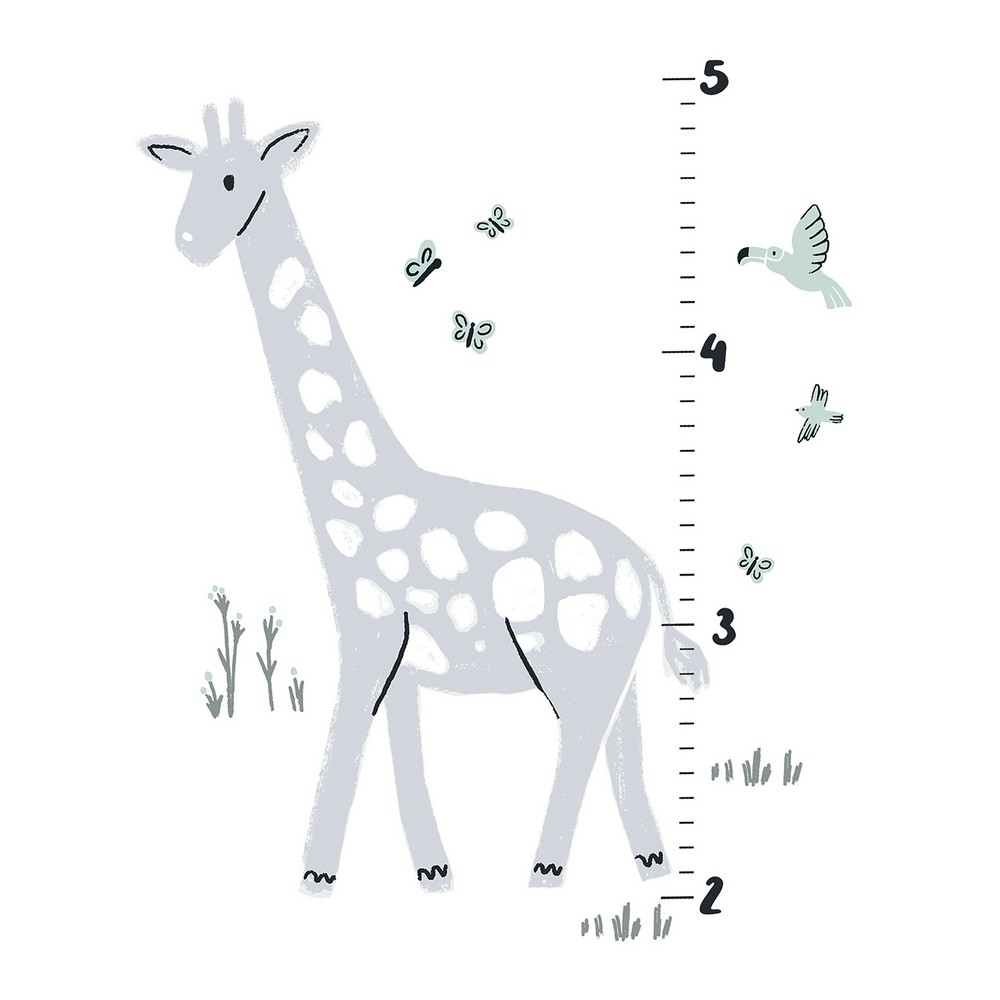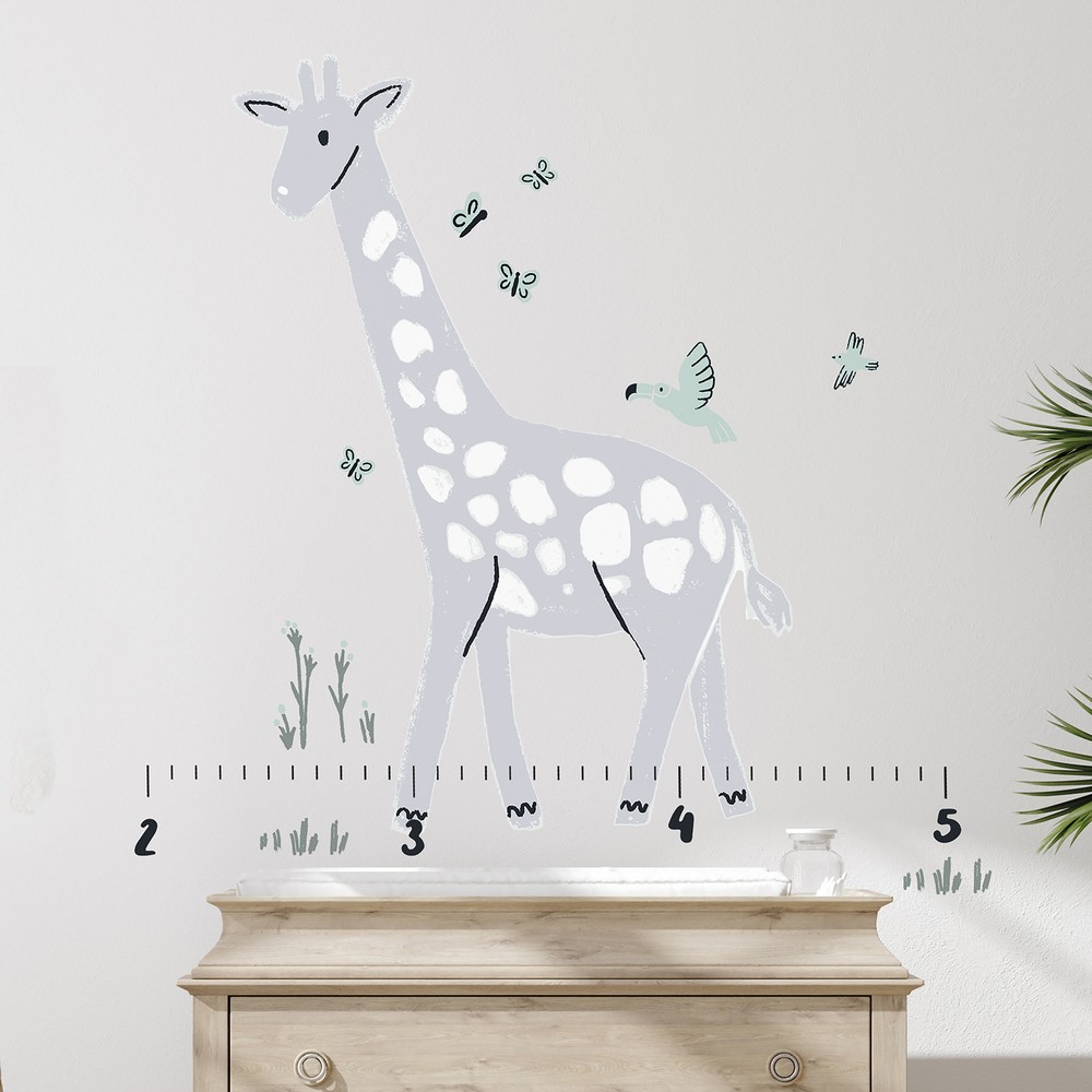 | Celebrate each of your little explorer's growth milestones with ease! Adorned with a charming giraffe, luscious greenery, playful birds, and fluttering butterflies, this growth chart measures up to 6 feet and is the perfect addition to any safari-themed nursery or playroom. Giraffe Growth Chart Grey Wall Decals contains 20 pieces on 1 sheet. RoomMates Color Family: Greys Kids Alphabet & Numbers Effect: |