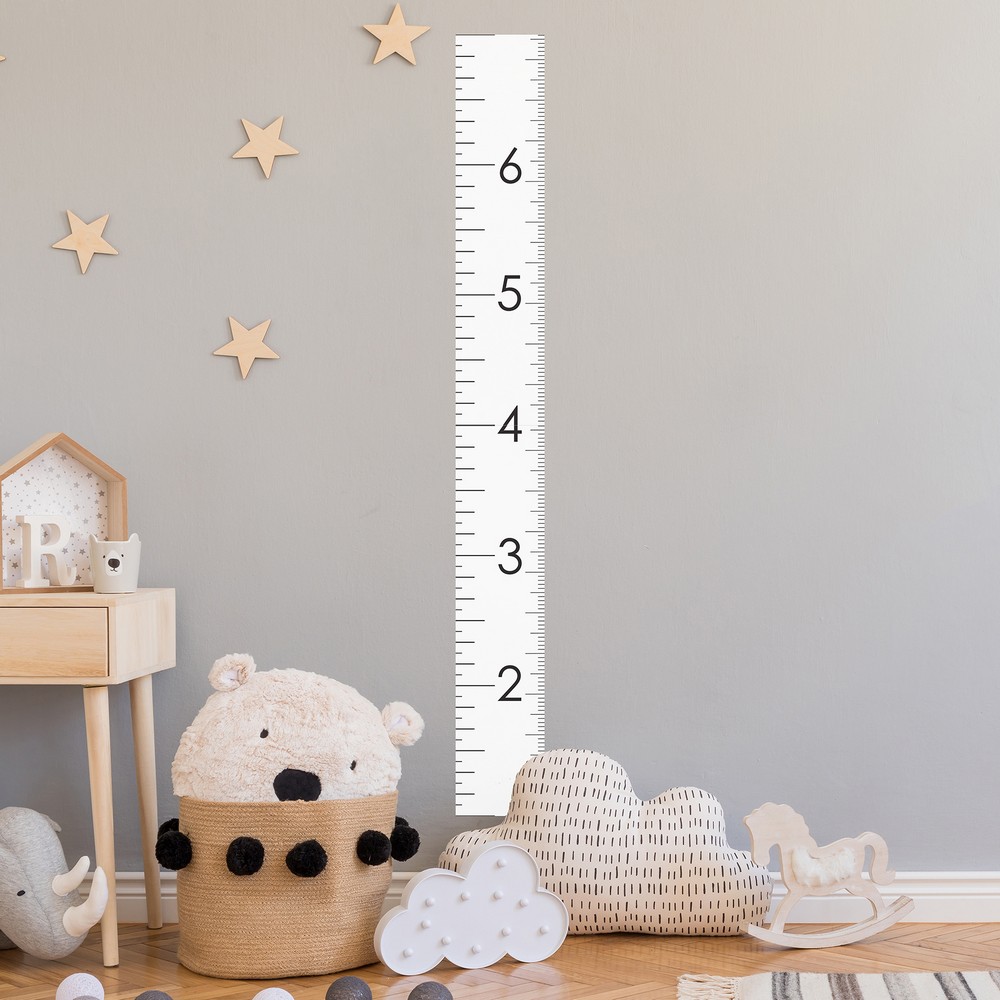 Chart your little one's growth towards the skies with this sleek and current peel and stick growth chart decal. This chart measures up to 7 feet, serving as a memorable keepsake that easily matches any design aesthetic. Crafted for convenience and style, it effortlessly repositions and removes without a trace, making it a perfect companion through all your child's growth spurts and room transformations. current Growth Chart White Wall Decals contains 2 pieces on 1 sheet.