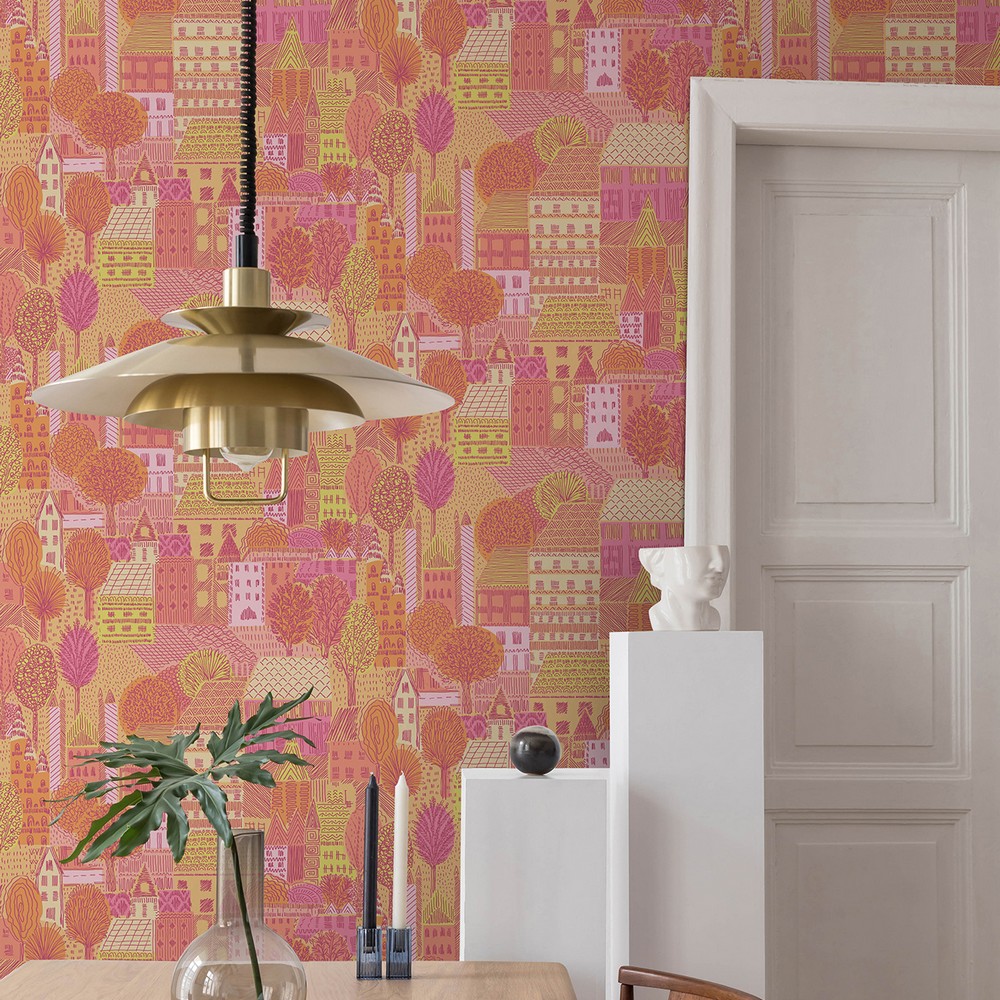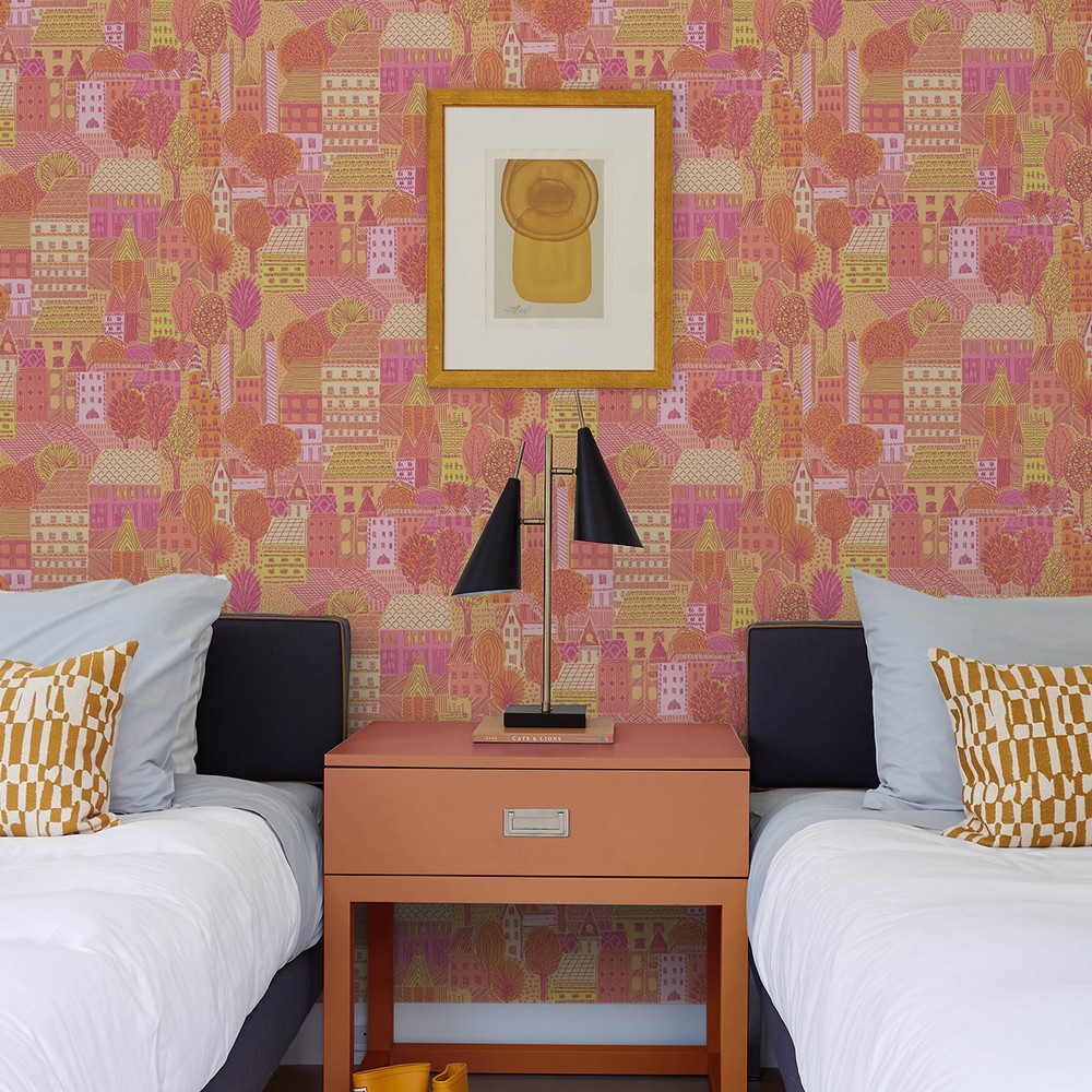 | Perfect for lovers of dopamine decor, this peel and stick wallpaper design brings an air of nostalgic euphoria to any room in just Peel, Stick…Done!® This print features a lively depiction of a quaint and quirky village in a feel-good pink and orange color color scheme. Charming Village Pink & Orange Peel and Stick Wallpaper comes on one roll that measures 20.5 inches wide by 18 feet long. RoomMates Peel & Stick Color Family: Pinks current Graphics Effect: |